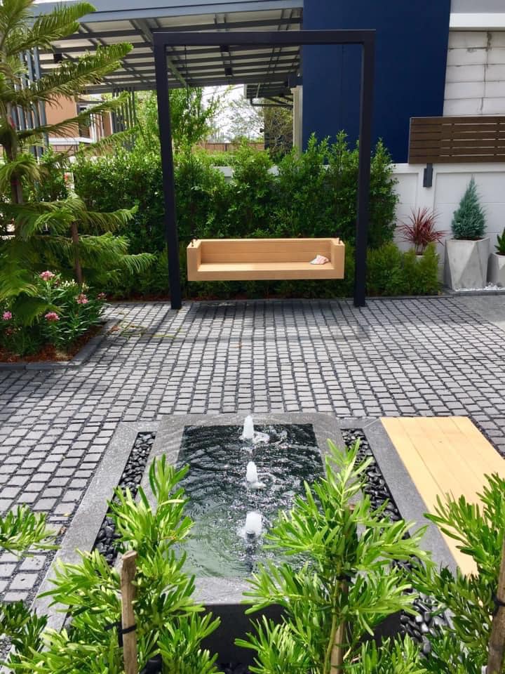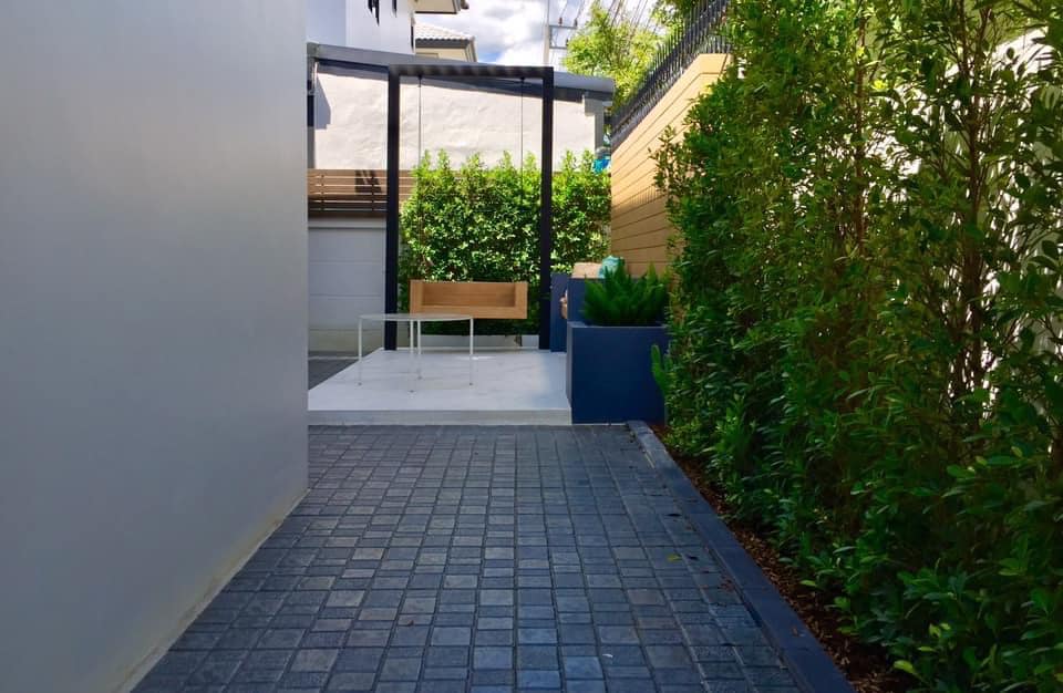 โดยทางเจ้าของบ้านอยากได้พื้นที่สีเขียว แต่ไม่ต้องการตัดหญ้าบ่อย ๆ ผู้ออกแบบสวน จึงทำการปูพื้นด้วยอิฐและหิน จากนั้นจึงจัดสวนเป็นแบบต้นไม้ขนาดเล็กที่ดูแลได้ง่าย มีพุ่มหนาสวยงาม