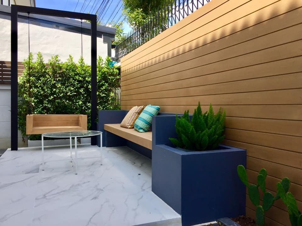 ถัดมาอีกมุมหนึ่งของบ้าน จะถูกตกแต่งให้เป็นพื้นที่นั่งเล่นนอกบ้าน โดยจะมีลานเล็ก ๆ พร้อมม้านั่งและชิงช้า ซึ่งตั่งอยู่ในส่วนที่มีร่มเงาของบ้าน จึงเป็นมุมพักผ่อนที่สงบร่มรื่นได้ตลอดทั้งวัน