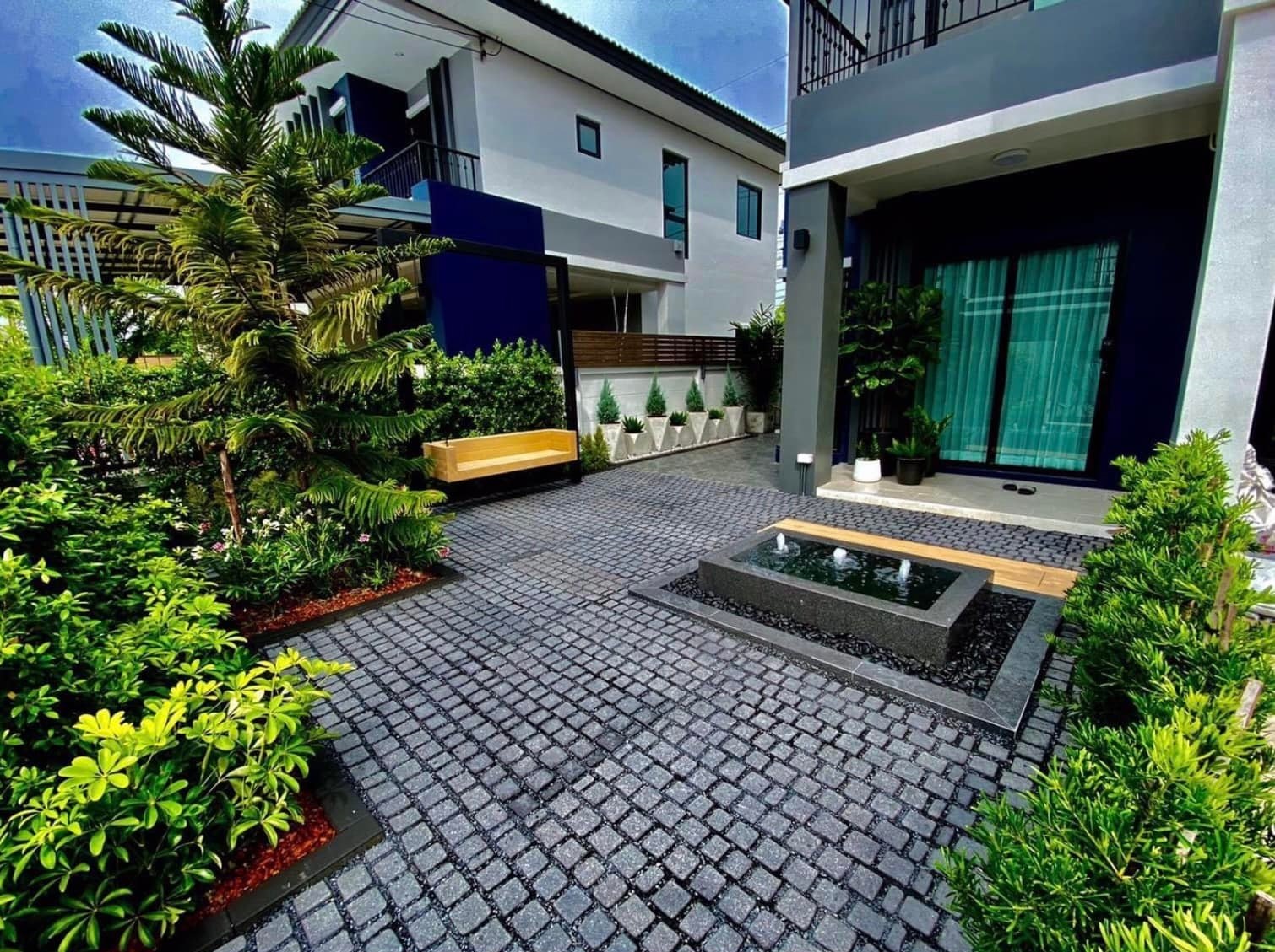 ที่กลางสวนได้ตกแต่งด้วยบ่อน้ำพุ ซึ่งจะช่วยสร้างบรรยากาศให้สวนและหน้าบ้านได้ดูสดชื่นขึ้น แถมยังเป็นฮวงจุ้ยที่เป็นมงคลอีกด้วย