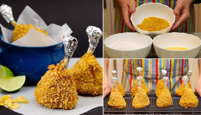8. ชุบน่องไก่กับแป้งทอดกรอบและเคาะแป้งส่วนเกินออก หลังจากนั้นนำไปชุบไข่และคอนเฟลกตาลำดับ