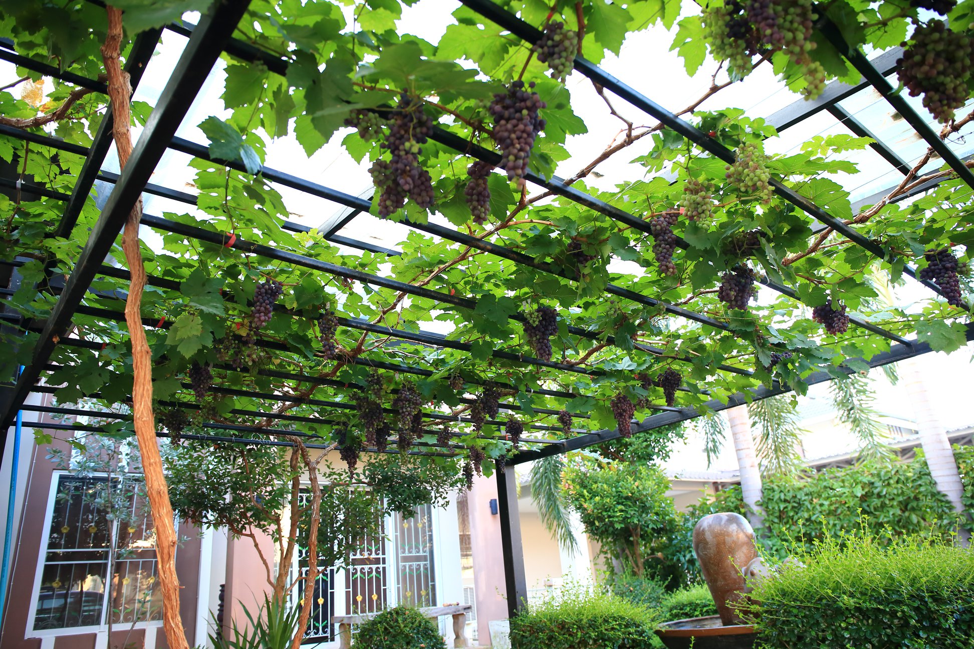 ต้นองุ่นขึ้นปกคลุมไปทั้งโครงเหล็ก แผ่กิ่งใบให้ร่มเงา ทำให้ด้านใต้กลายเป็นพื้นที่พักผ่อนสุดชิลล์อีกแห่งหนึ่งของบ้านไปได้ทันที