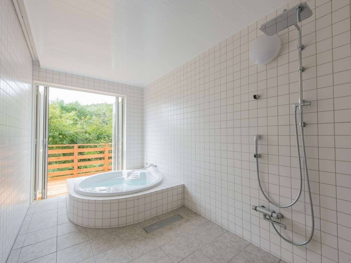 สำหรับห้องน้ำ ก็จะมีบรรยากาศการออกแบบที่เรียบง่ายแบบญี่ปุ่น โดยมีอ่างแช่น้ำขนาดใหญ่ที่สามารถมองเห็นวิวภายนอกได้อีกด้วย
