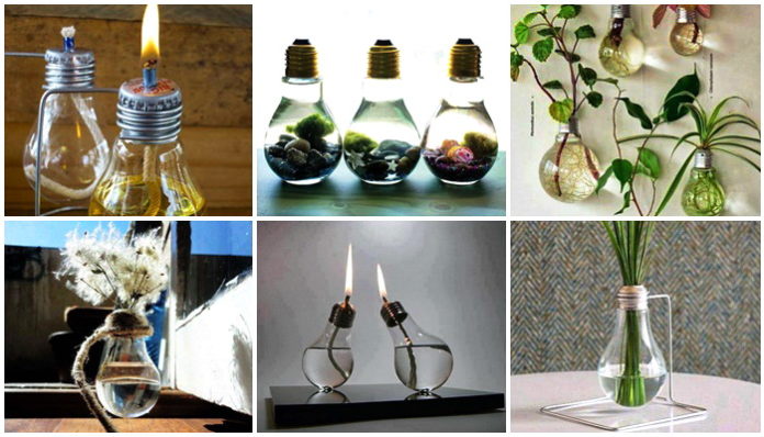 หลอดไฟ ไร้ค่าสามารถนำมาทำเป็นตะเกียงดีไซน์สวย โดยตัดส่วนขั้วหลอดไฟออกเติมน้ำมันก๊าซลงไป หาฝาขวดน้ำมาสักหนึ่งชิ้น เจาะรูและใส่เชือกสำหรับจุดตะเกียงลงไป เพิ่มความเก๋ด้วยการนำขดลวดมาทำฐานวาง เพียงเท่านี้คุณก็จะได้หลอดไฟตะเกียงแสนสวยไว้ใช้งาน