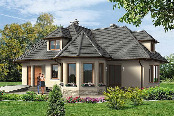 เริ่มจากตัวบ้าน ออกแบบเป็นบ้านคอนกรีตสองชั้น ผนังภายนอกฉาบปูนเรียบสีขาวอมเทา ด้านหน้าจะเป็นโดมห้องทานอาหาร มีหน้าต่างรอบทิศ ช่วยสร้างบรรยากาศโรแมนติคยามทานอาหารได้ดี ส่วนหลังคาเลือกใช้ทรงปั้นหยาเล่นระดับมุงด้วยกระเบื้องโทนสีเทา