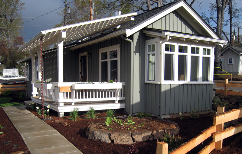 ลักษณะบ้านขนาดชั้นเดียว ภายนอกตกแต่งโทนสีเทา เลือกใช้หลังคาทรงหน้าจั่ว บริเวณทางเข้าบ้านมีเฉลียงไม้สำหรับพักผ่อน ตกแต่งสีรั้วเฉลียงและเสาบ้านด้วยสีขาว ด้านข้างของตัวบ้านติดหน้าต่างวงกบสีขาว รับแสงจากภายนอกได้อย่างเต็มที่