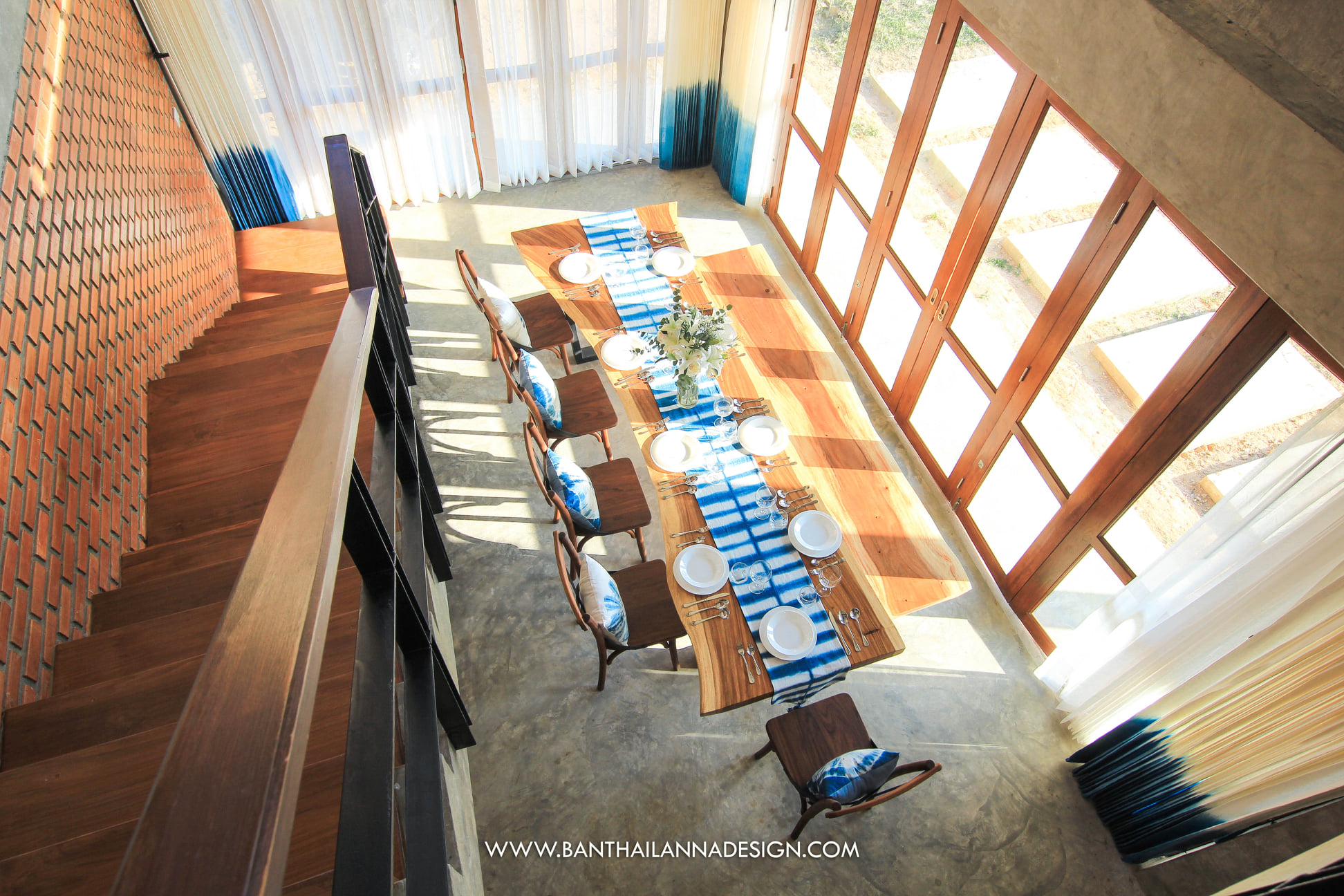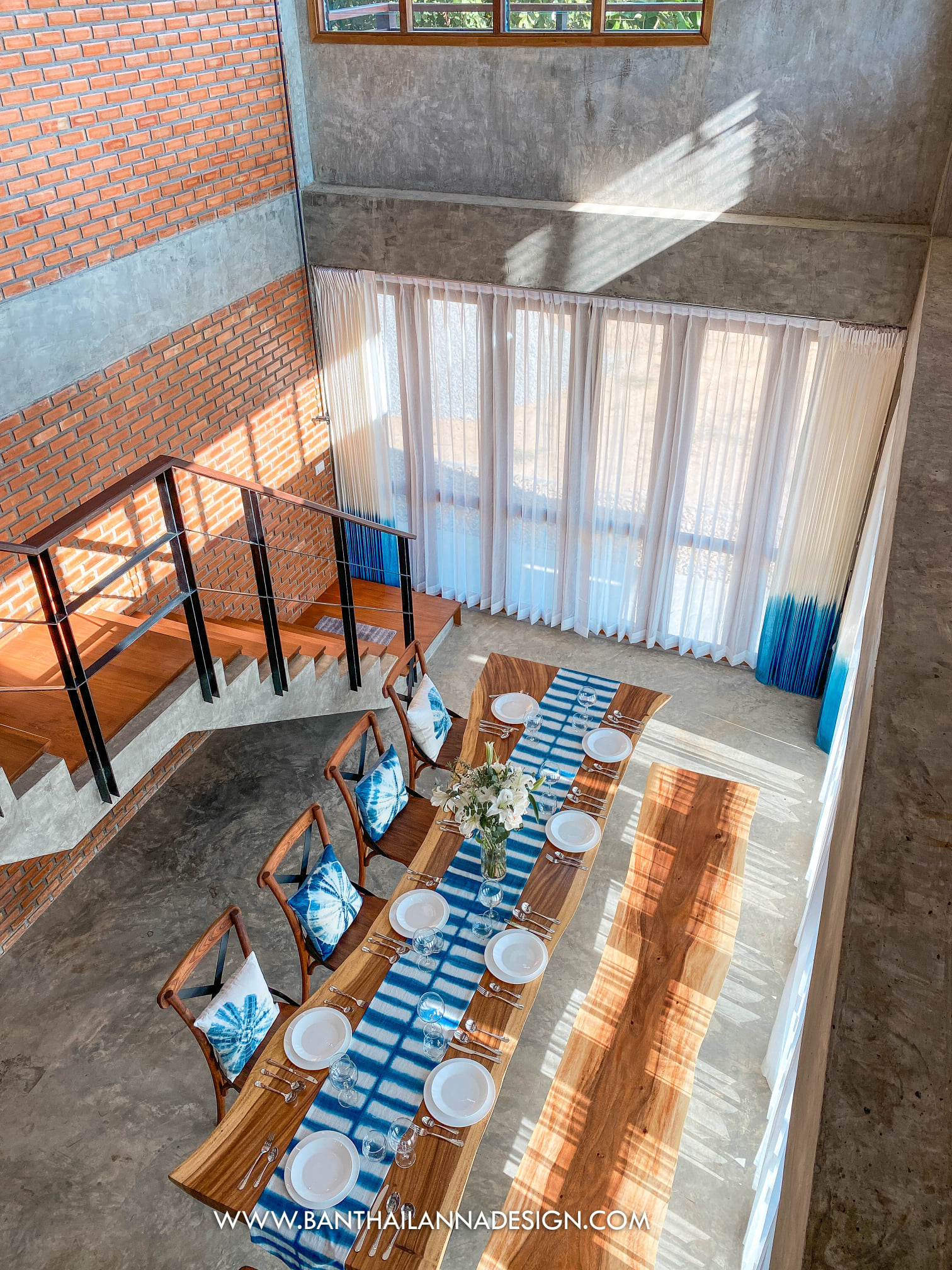 ประกอบกับการใช้ผ้ามัดย้อมด้วยฮ่อมธรรมชาติ ตกแต่งทั้งในส่วนผ้าม่านและชุดที่นอน เพิ่มบรรยากาศความเป็นพื้นถิ่นและดูอบอุ่นให้กับห้องได้เป็นอย่างดี