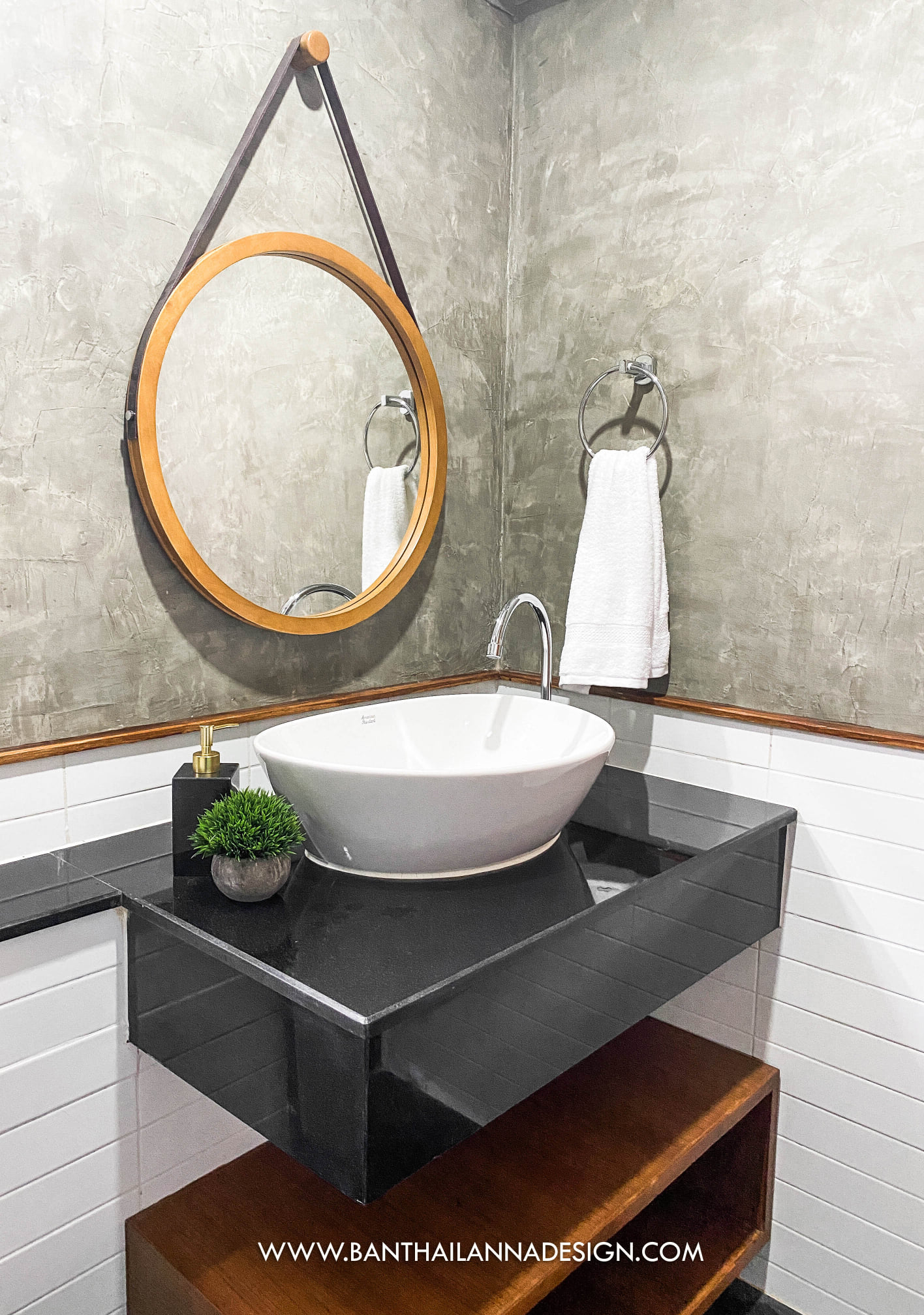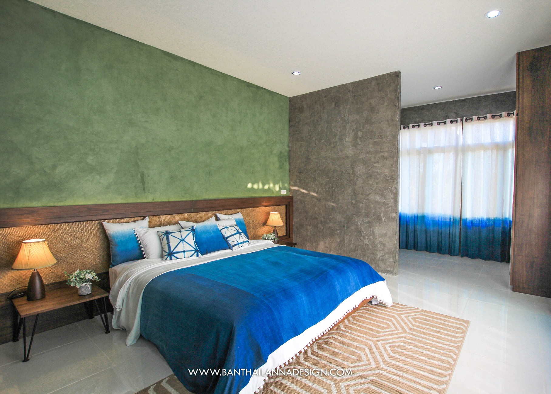 ห้องนอนมีการใช้ผนังปูนขัดมันสไตล์ลอฟต์สีเขียว เพื่อให้ผนังห้องมีเท็กเจอร์และสีสันที่น่าสนใจ
