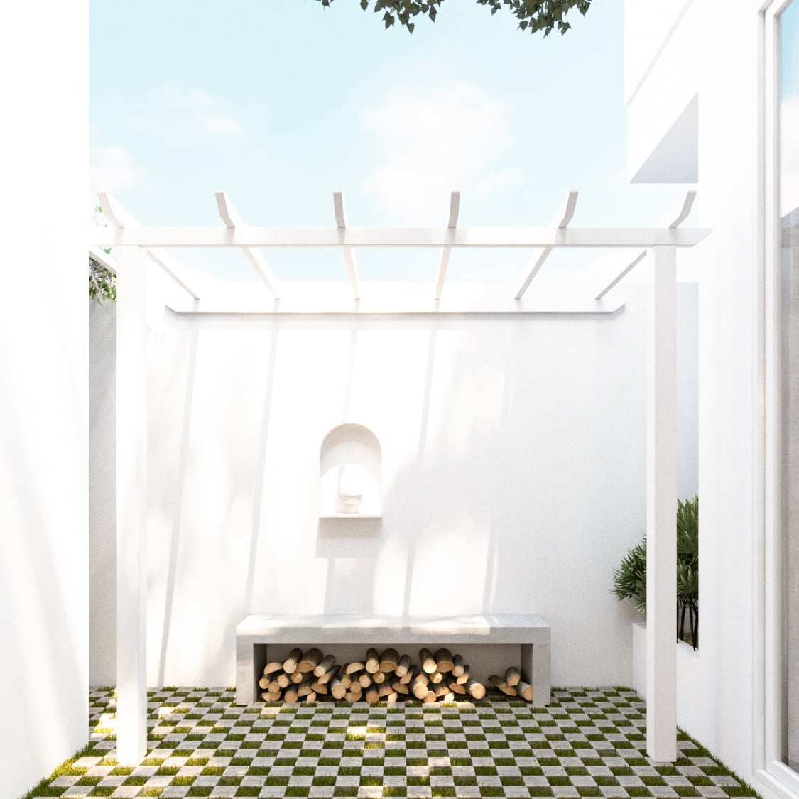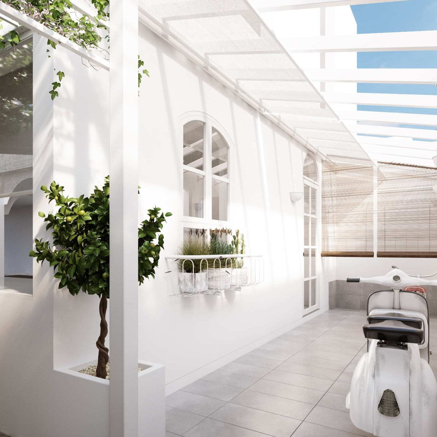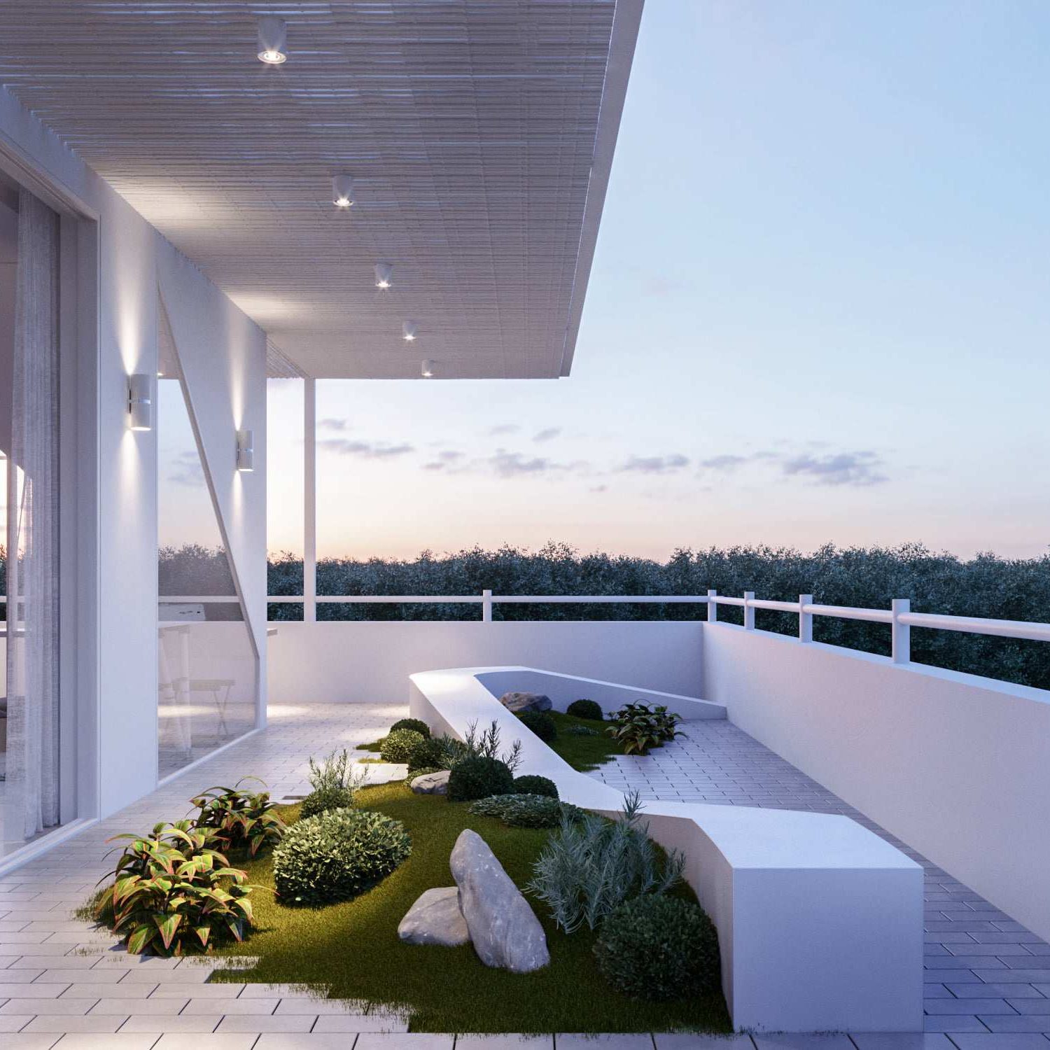 ภายนอกบ้านมีเฉลียงขนาดใหญ่ที่ภายนอกยังจัดสวนหย่อมขนาดเล็กเอาไว้อีกด้วย โดยเป็นอีกมุมที่ออกแบบมาเพื่อการออกแบบนอกบ้านโดยเฉพาะ
