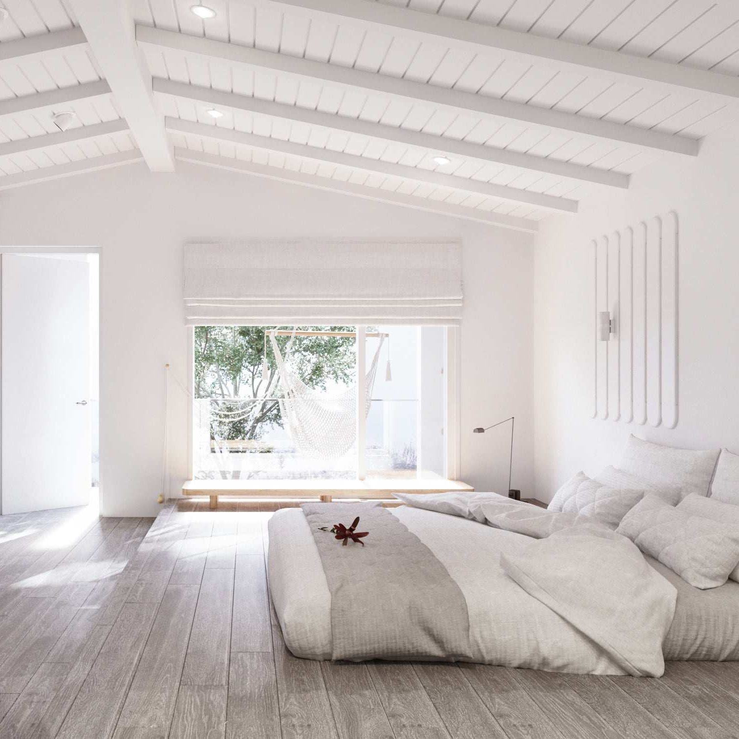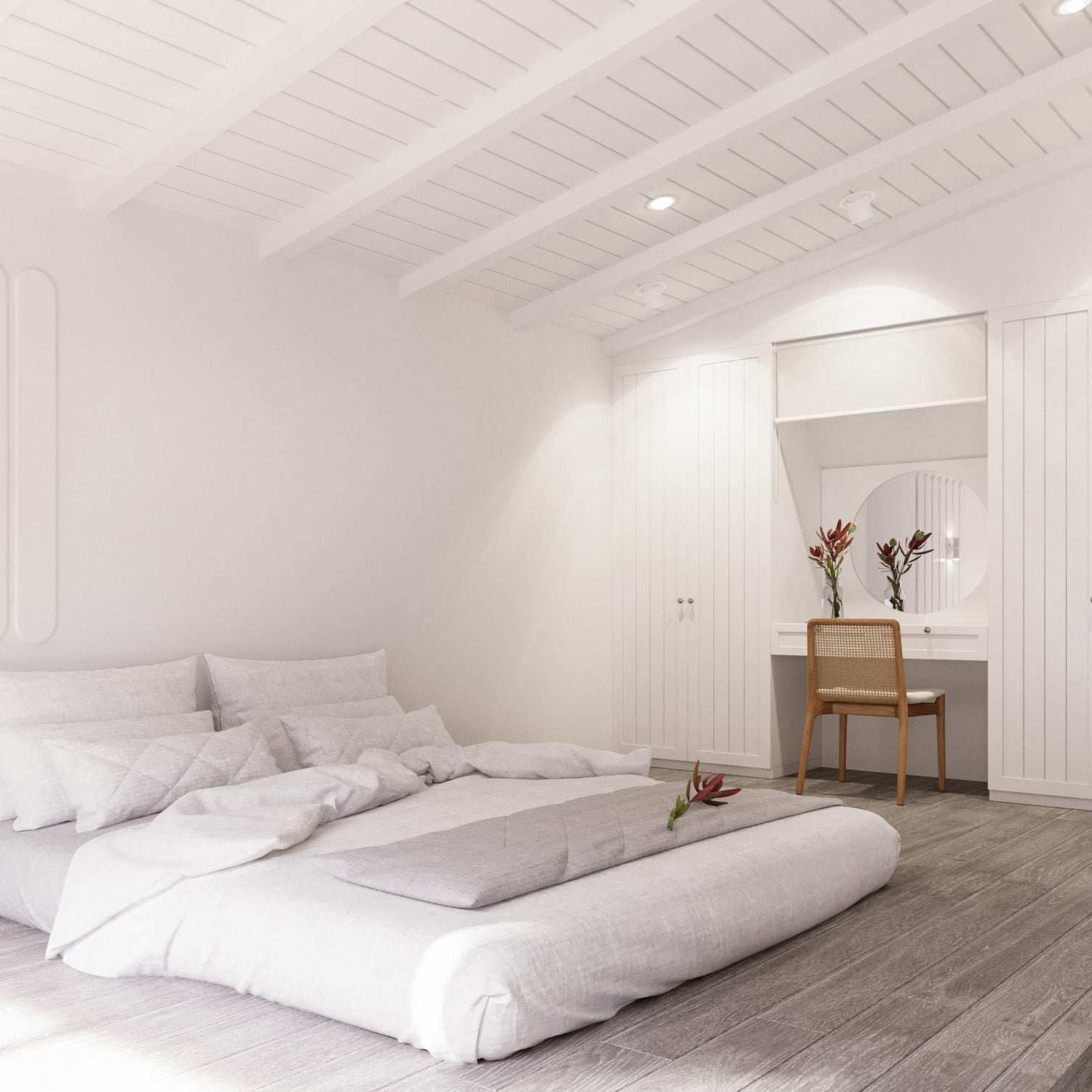 ทางด้านของห้องนอน ก็เป็นอีกห้องที่สะท้อนกลิ่นอายความมินิมอลได้อย่างชัดเจน ภายในโปร่งสบาย ตกแต่งในโทนสีแบบเอิร์ธโทนที่ให้บรรยากาศผ่อนคลาย