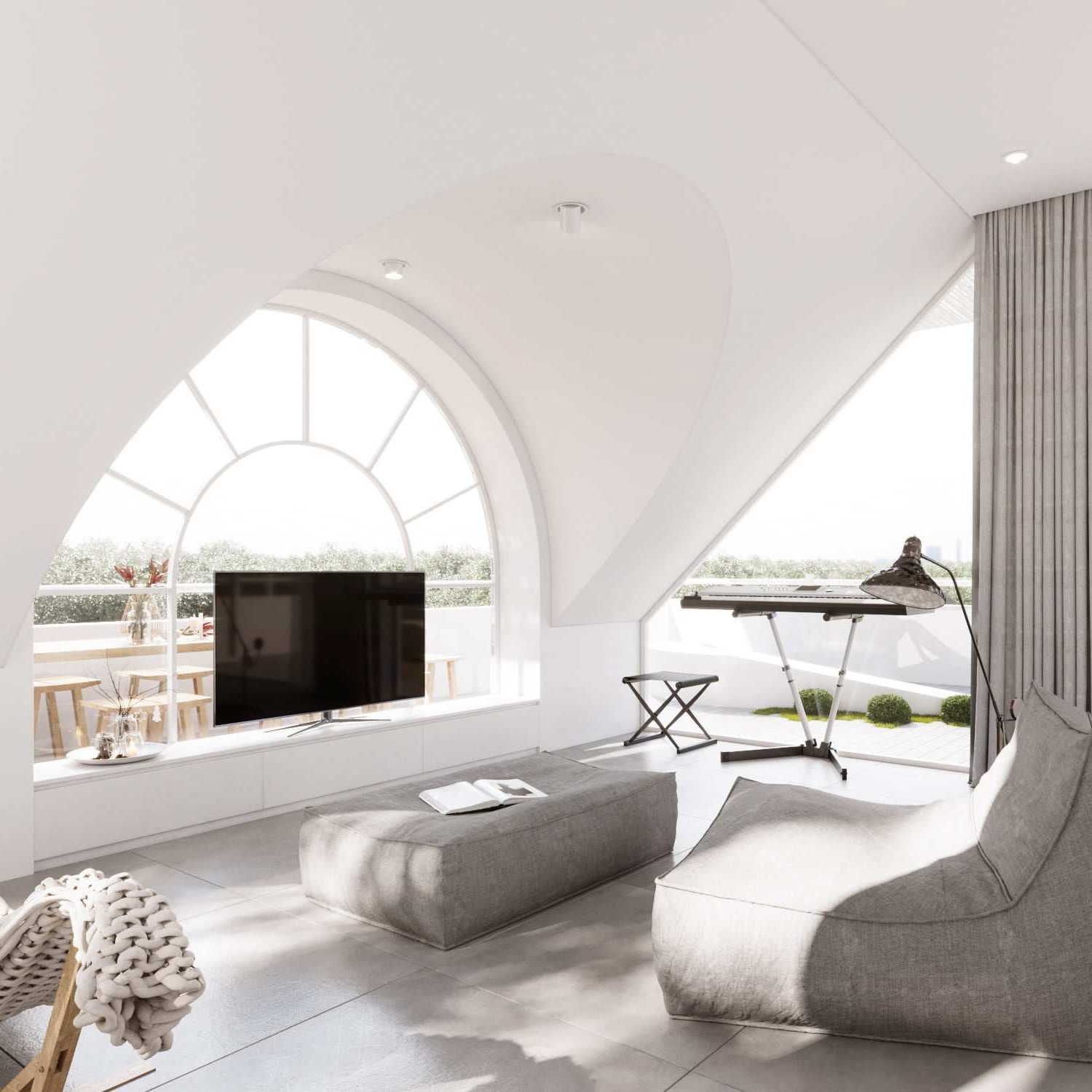 สำหรับห้องนี้เป็นห้องนั่งเล่นที่ตั้งอยู่ชั้นสองของบ้าน ภายในมีบรรยากาศที่โปร่งสบายผ่านหน้าต่างทรงโค้งที่เห็นวิวทิวทัศน์จากภายนอกอย่างชัดเจน