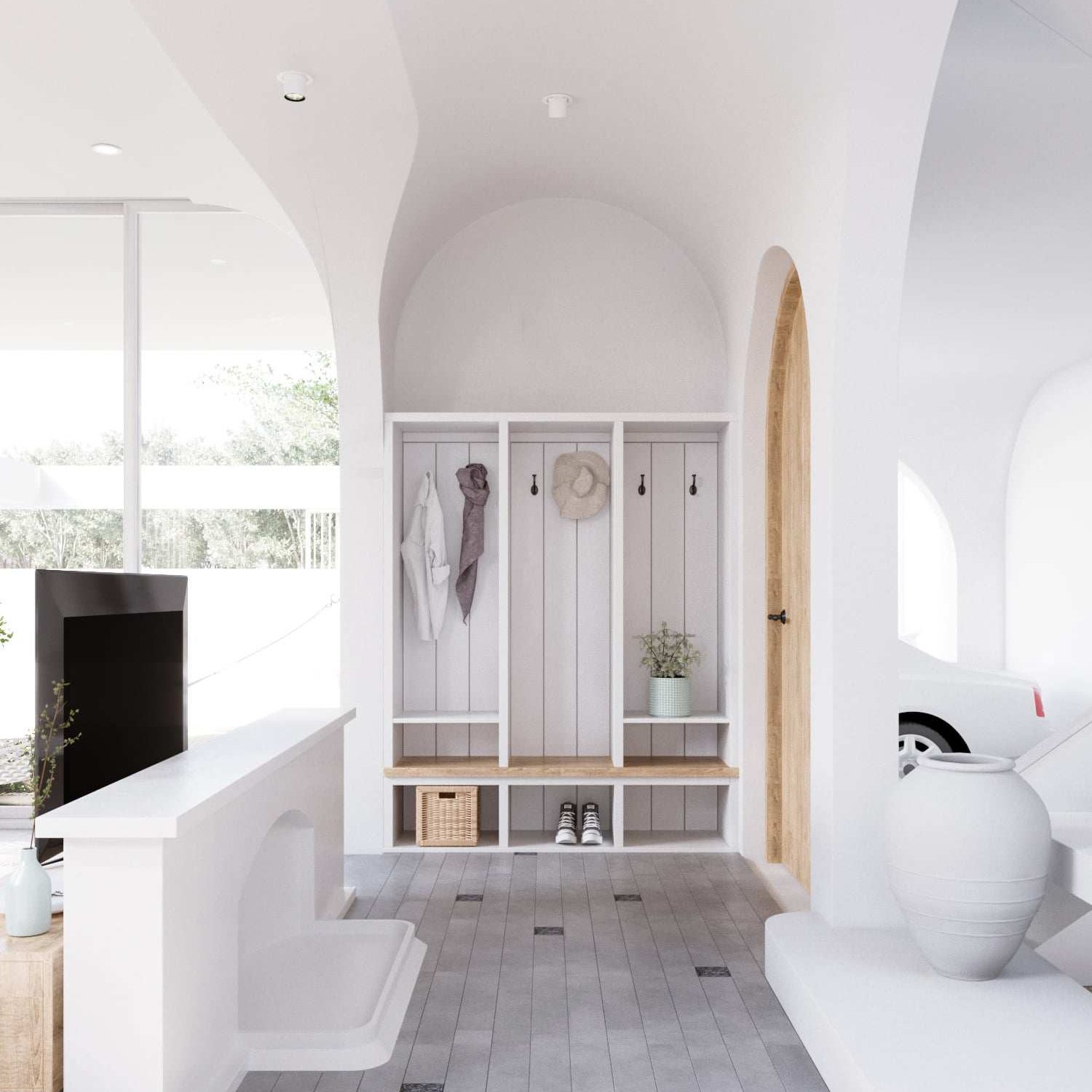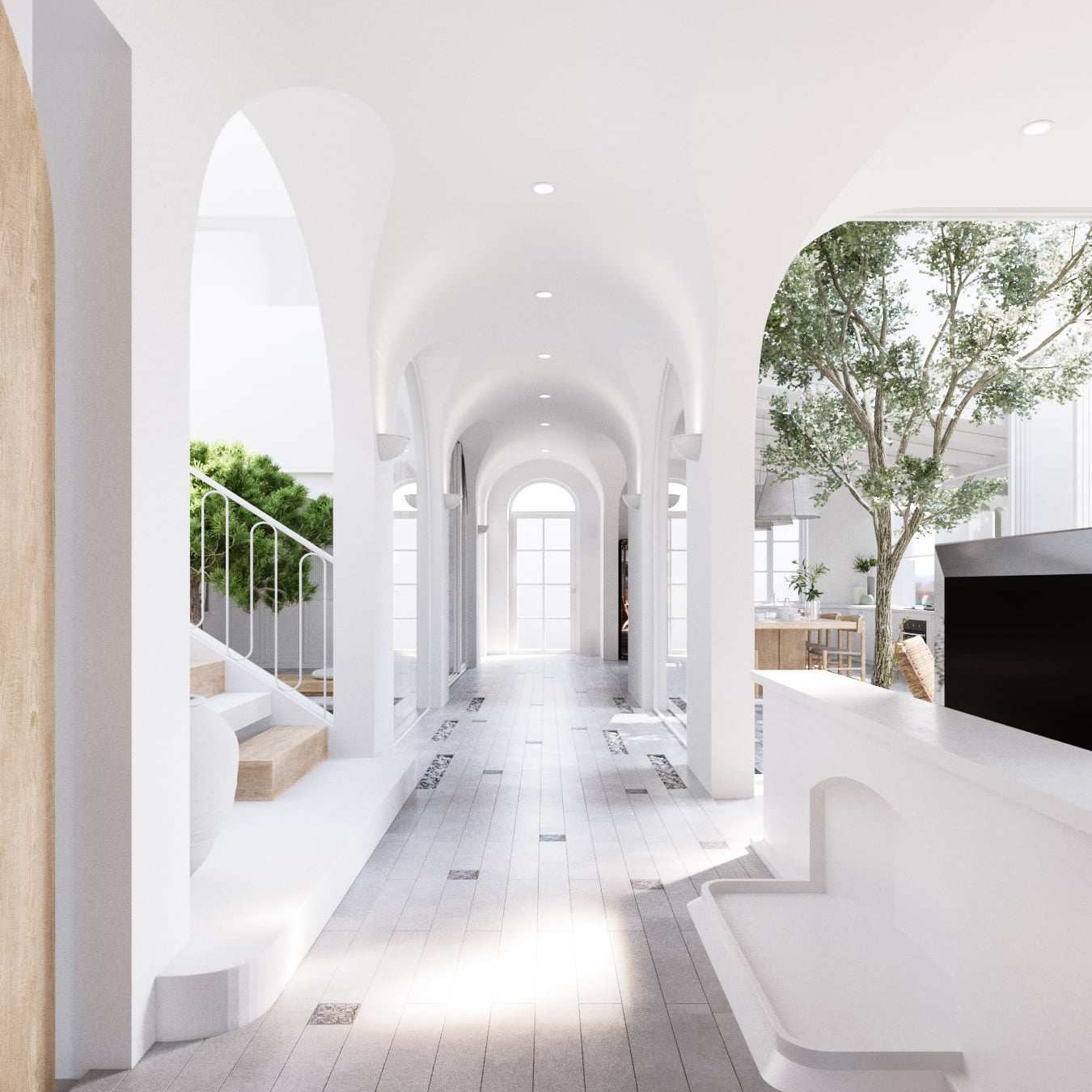 เมื่อเข้ามาภายในบ้าน เราก็จะพบกับห้องโถงของบ้านที่มีความโดดเด่นในการออกแบบเพดานทรงโค้งตามแบบบ้านสไตล์ยุโรป จึงให้ความสวยงามหรูหราได้เป็นอย่างดี