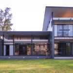 ตัวบ้านโครงสร้างเหล็ก ยกพื้นสูงเล็กน้อย ให้ตัวบ้านดูเบาขึ้น ออกแบบรูปทรงของบ้านแบบทรงกล่องสี่เหลี่ยม ที่ดูเรียบง่าย หลังคาทรงแบนซ่อนการระบายน้ำ เน้นย้ำสไตล์ของบ้านได้ดีเยี่ยม
