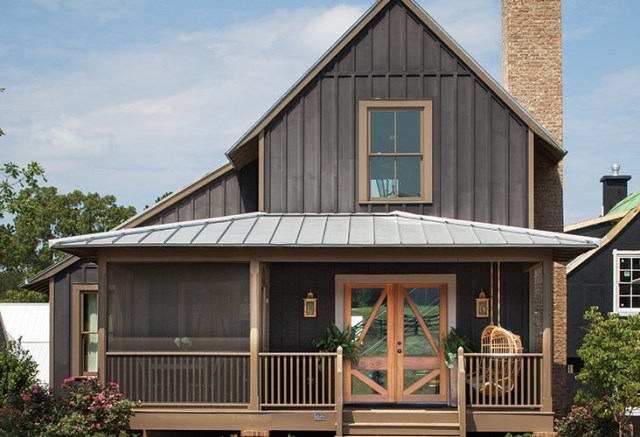 ตัวบ้านโครงสร้างไม้ ออกแบบรูปทรงที่เรียบง่าย จับคู่กับหลังคาจั่ว ที่เป็นที่นิยมของคนไทยเช่นกัน ช่วยเรื่องระบายอากาศได้ดีกว่าหลังคาชนิดอื่นๆ ตกแต่งผนังด้วยสีเทาเข้มๆ และไม้สีสีน้ำตาล แต่งแต้มให้มีรายละเอียดของบ้านอีกด้วย