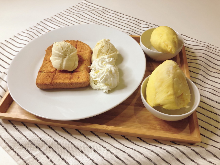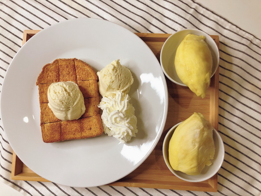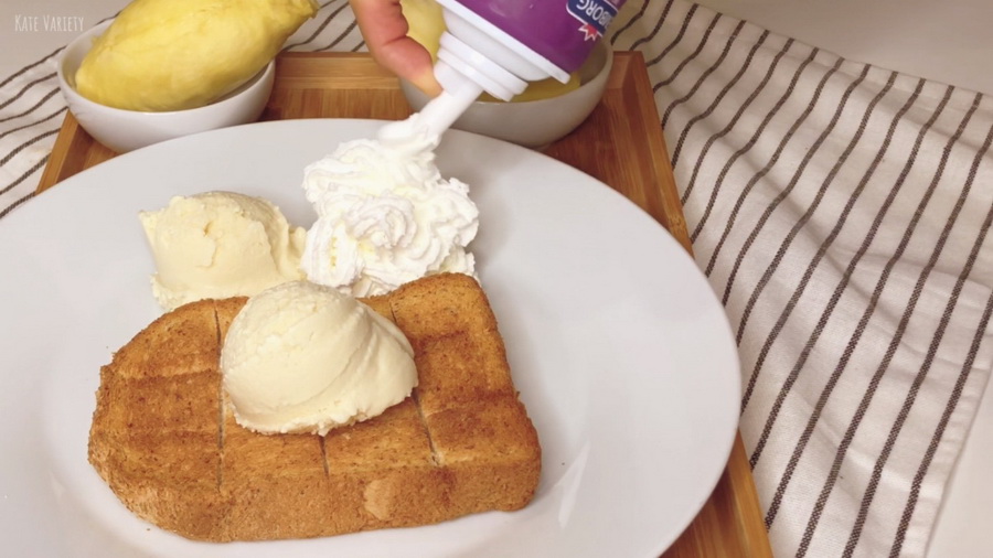 7. ได้เวลาชิมกันแล้วจร้า ไอติมทุเรียน เสิร์ฟคู่กับขนมปังปิ้ง วิปครีมนมสด และทุเรียนสด
