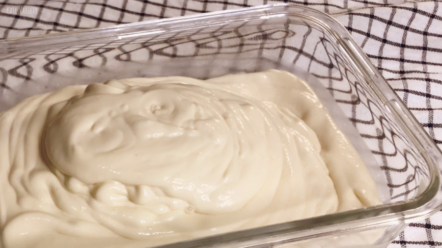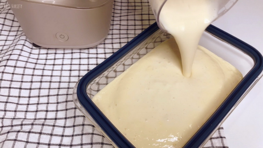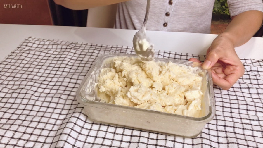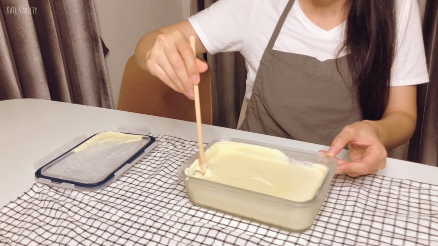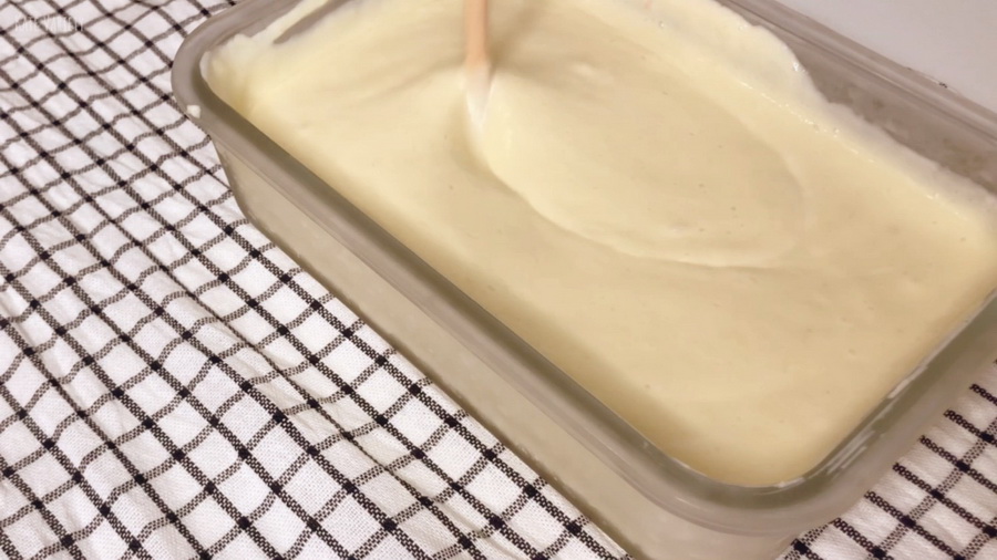 5. หลังจาก 2 ชั่วโมงแล้ว นำไอติมออกมาจากตู้เย็น และคนให้เข้ากันอีกรอบ เพื่อเพิ่มความเนียนของเนื้อไอติม