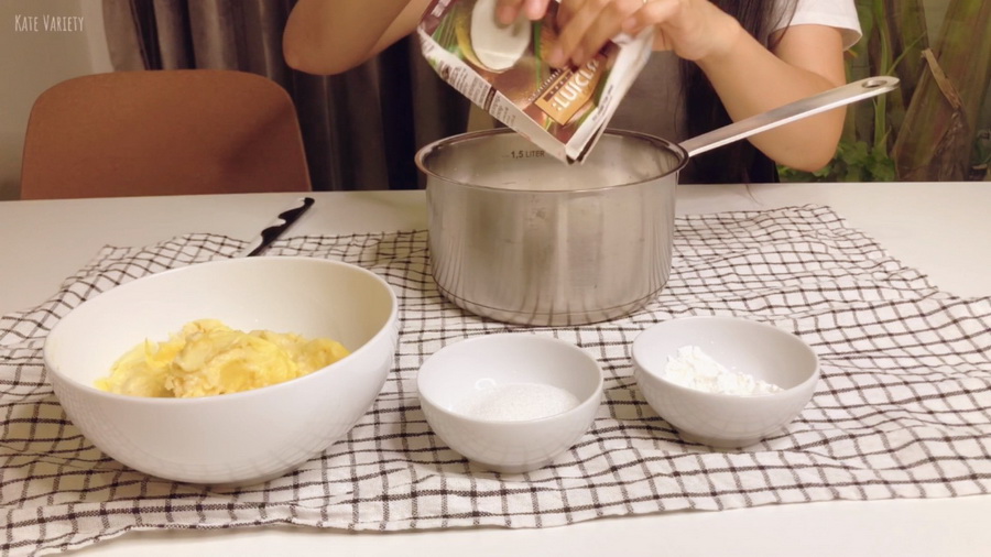 1. เนื้อทุเรียน 300 g (ประมาณ 3 เม็ด )