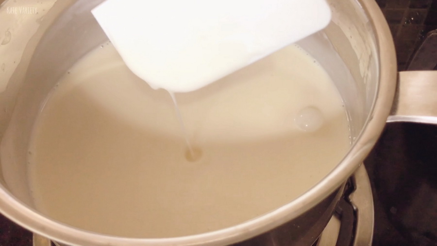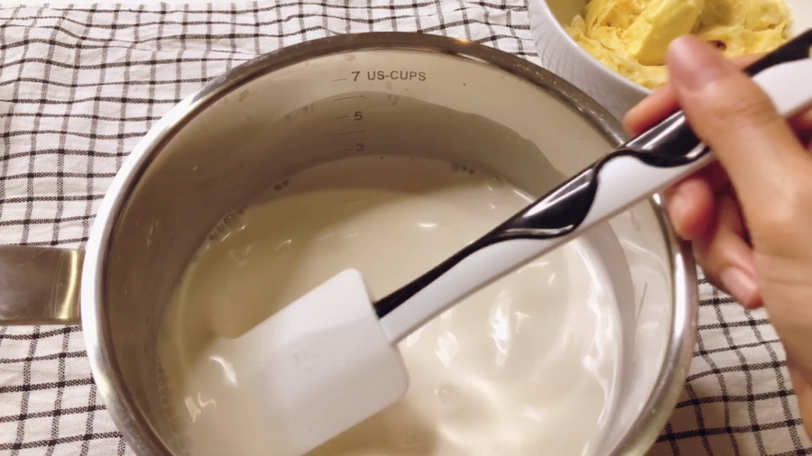 2. นำกะทิไปตั้งไฟอ่อน ๆ คนตลอดเวลา จนกว่ากะทิจะมีความหนืดเล็กน้อย (ห้ามทำให้กะทิเดือดนะคะ จะแตกมันได้)