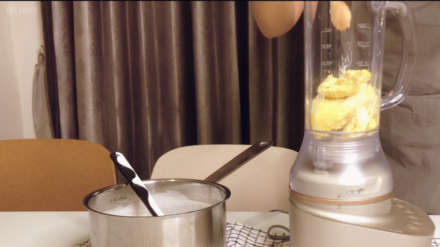 3. นำเนื้อทุเรียนและกะทิที่เย็นแล้ว มาปั่นให้ละเอียด