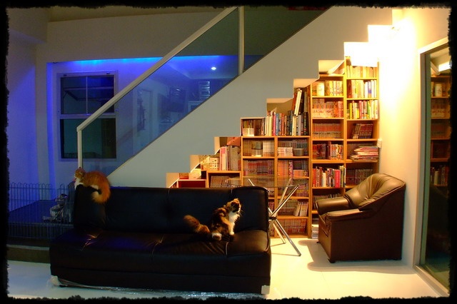 ขึ้นข้างบนดีกว่าครับ บันไดเป็นกระจกเพราะว่าผมมีทั้งหมาและแมว กันตกครับ ถ้าเป็นลวดจะดูโปร่งกว่านี้แต่ว่าเพื่อความปลอดภัยครับ