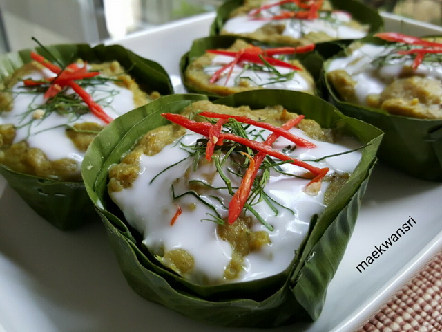 5. ราดหน้าด้วยกะทิ แต่งหน้าด้วยพริกกับใบมะกรูดให้สวยงาม