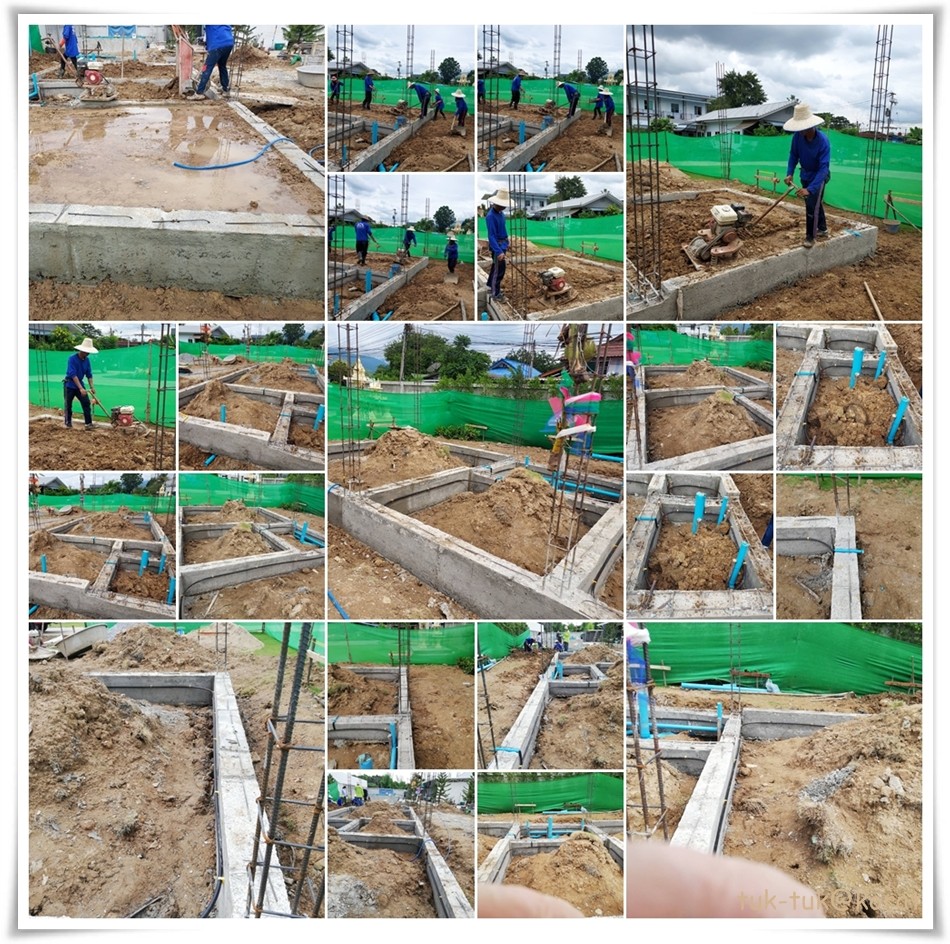 ถมดิน ทราย บดให้แน่น อัดน้ำเพื่อไม่ให้ดินทรุดเกิดช่องโหว่กับเสา