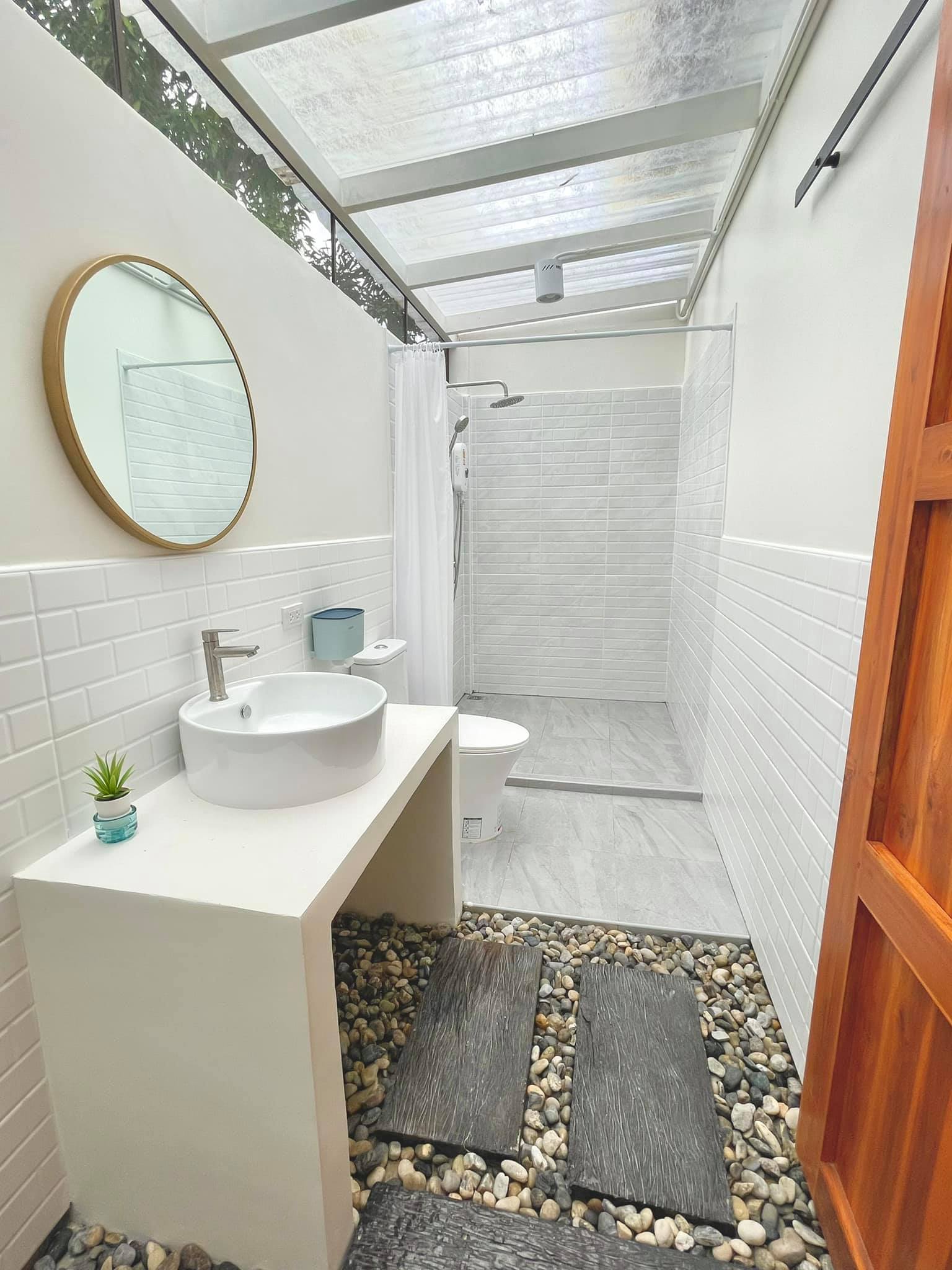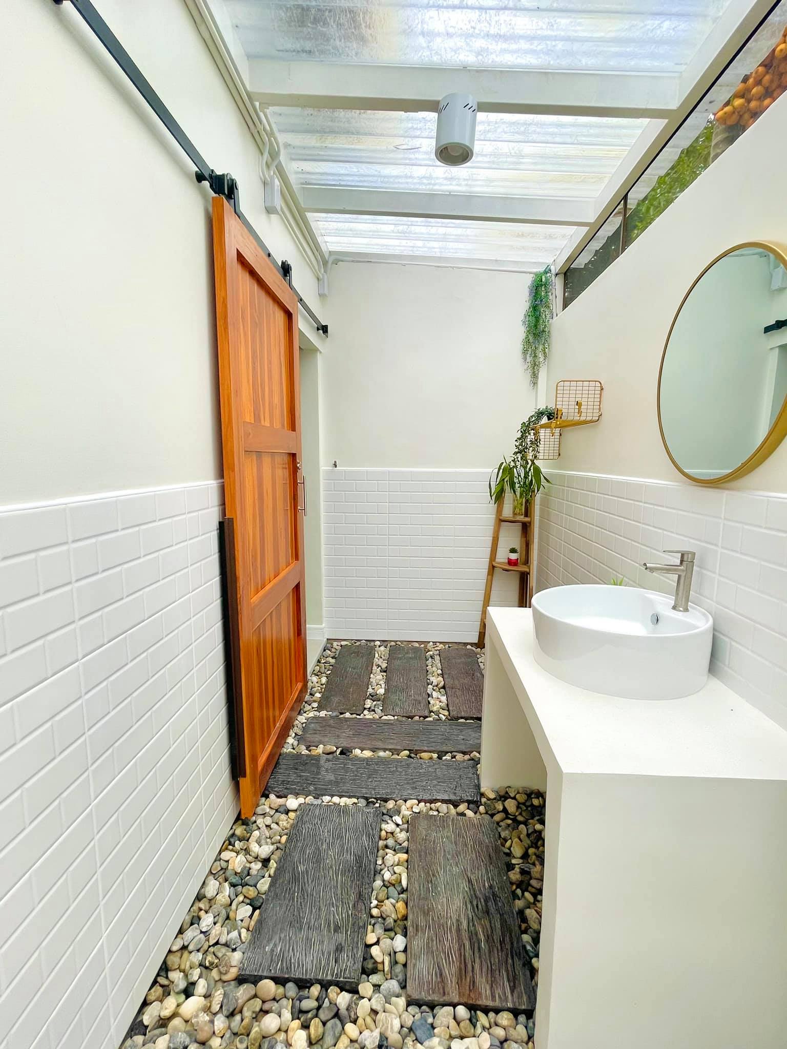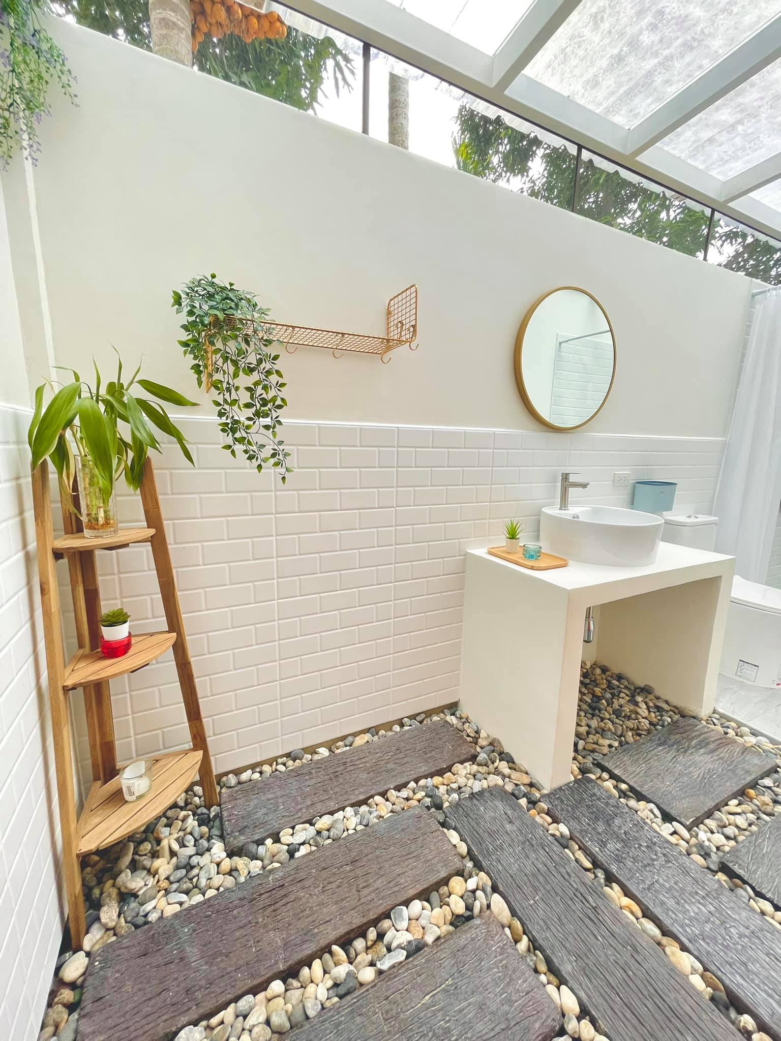 ห้องน้ำของบ้านถูกออกแบบมาเป็นอย่างดี โดยจุดเด่นจะอยู่ที่หลังคาสกายไลท์ที่ช่วยให้แสงสว่างภายในห้องน้ำได้อย่างทั่วถึง