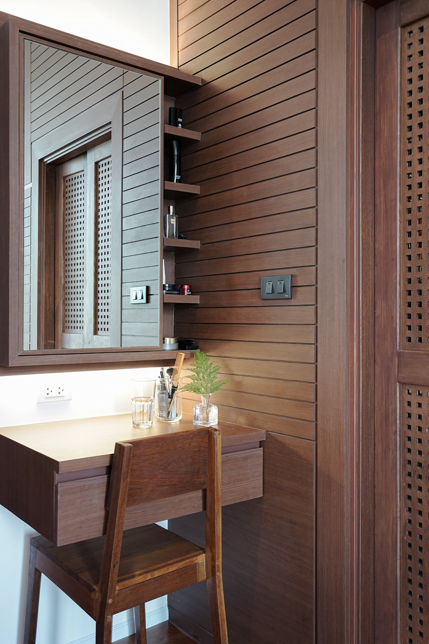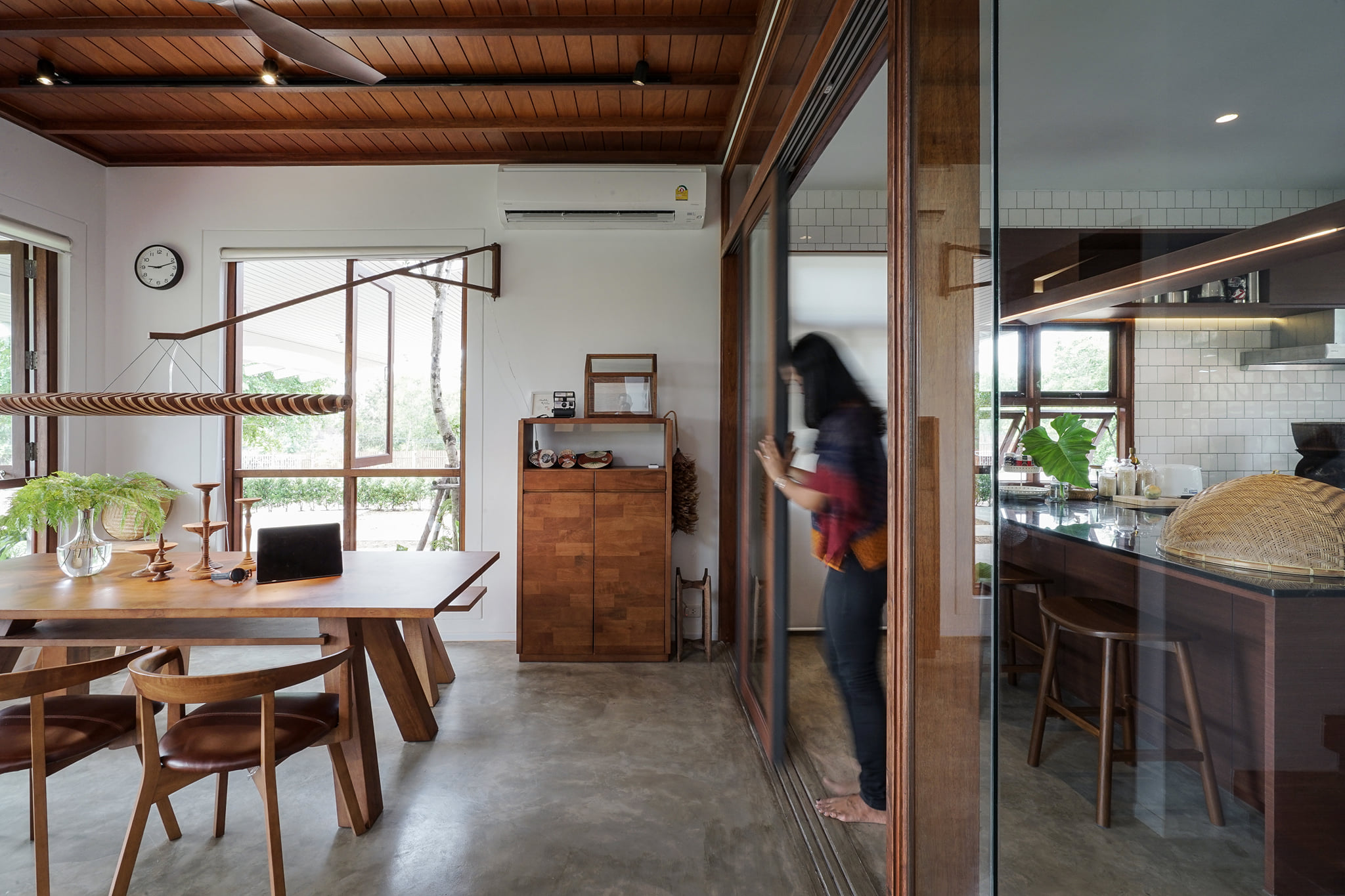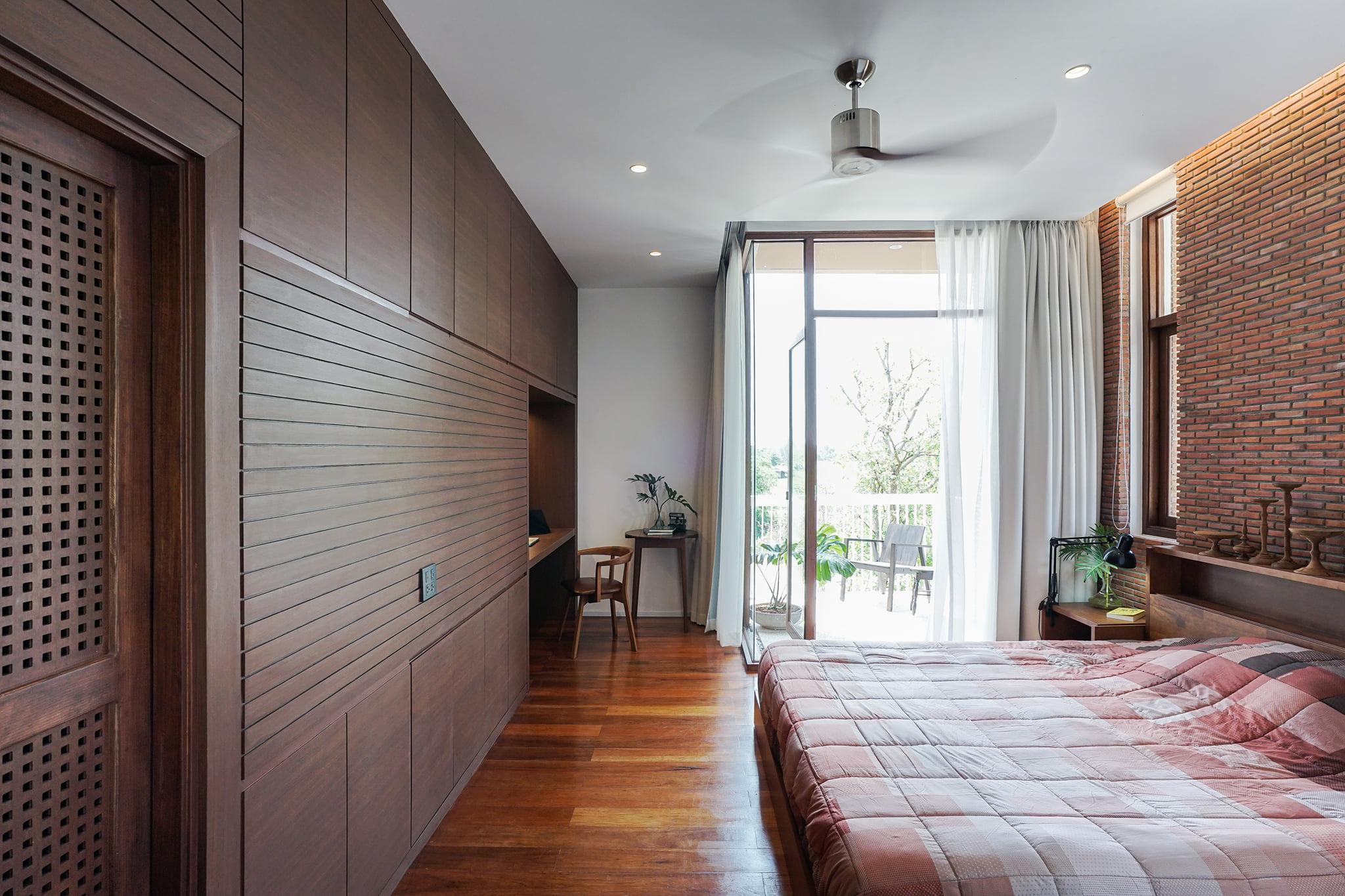 อาจจะมีช่วง เม.ย.-พค. ที่ร้อนจัด ๆ ก็มีโหยหาแอร์ ชอบที่ห้องนอนเงียบสนิทด้วย เวลาฝนตกแทบไม่ได้ยินเสียงเลย ต้องขอบคุณกำแพงอิฐสามชั้นที่ทำให้บ้านเย็น และเก็บเสียงได้ดี หากใครชอบบ้านแบบโปร่งสไตล์นี้ แนะนำให้ติดมุ้งจีบหรือมุ้งลวด เพราะตอนกลางคืน จะหายใจไม่ออก