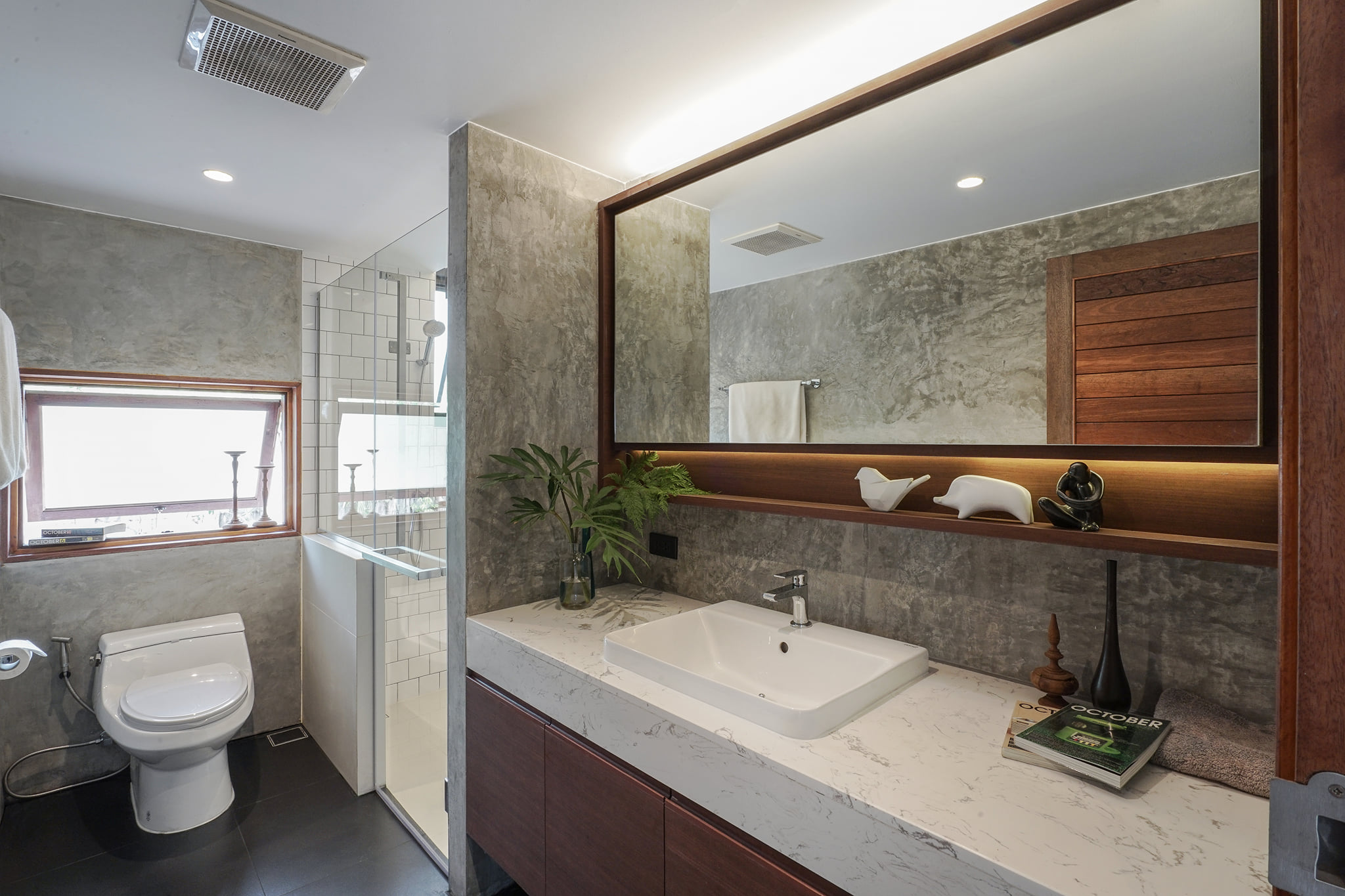 รีบปรับลดสเปคลงแทบไม่ทัน เช่น เปลี่ยนหน้าต่างในห้องน้ำจากไม้เป็นอะลูมิเนียม เปลี่ยนมาใช้ปูนเปลือยเพื่อลดค่าใช้จ่าย ซึ่งสถาปนิกก็เข้าใจและปรับลดสเปคตามที่เราต้องการ หรือตรงส่วนไหนที่เห็นว่าไม่จำเป็นสถาปนิกก็แนะนำให้ตัดออก