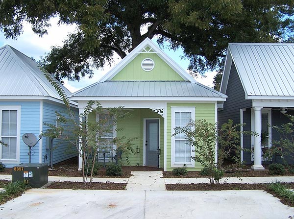ตั้งอยู่ทามกลางสนามหญ้า ที่มีไม้ยืนต้นเป็นฉากหลัง เน้นตัวบ้านให้โดดเด่นยิ่งขึ้น ตกแต่งเพียงเล็กน้อยไปกับไม้พุ่ม สร้างบรรยากาศที่ร่อรื่นแก่บ้านได้ดี