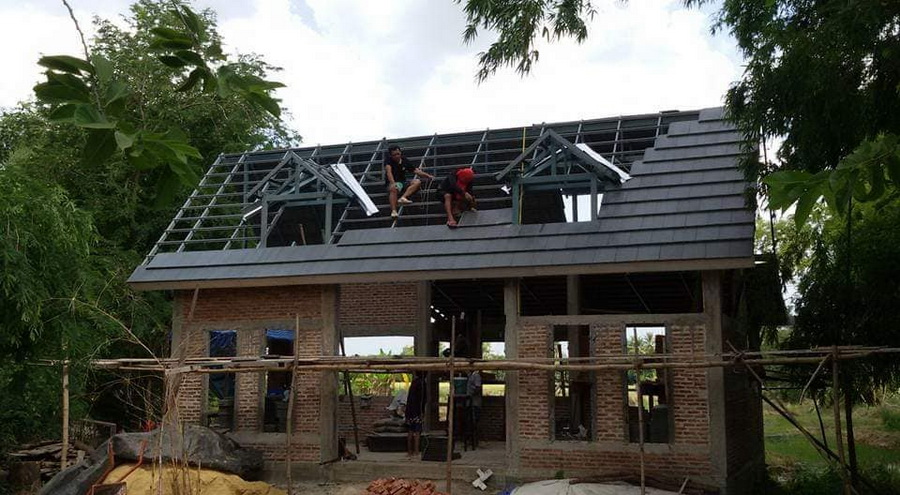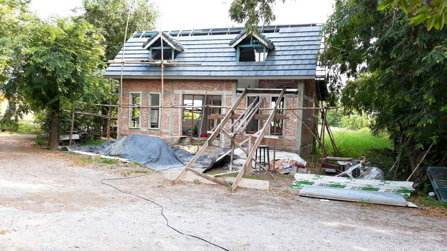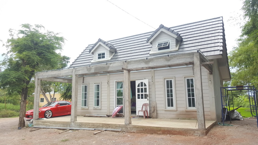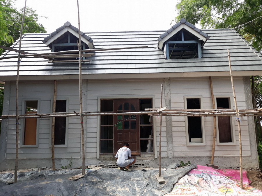 ทำการปูหลังคากันเอง โดยคนในครอบครัวช่วยกันปูครับ ยากตรงมขจั่วหน้าบ้าน 2 อันนี้แหละครับ ใช้เวลานานมาก ๆ กว่าจะทำหลังคาเสร็จ ก็มั่ว ๆ ลองผิดลองถูกไป แต่ก็เสร็จมาด้วยดี