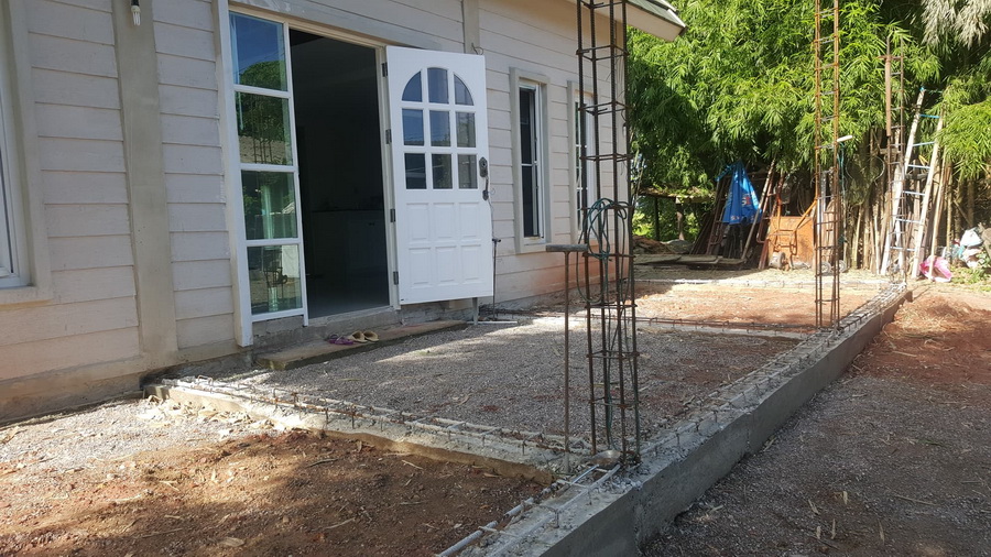 เริ่มทำระเบียงหน้าบ้านกันต่อครับ ผมเริ่มขุดหลุม ผูกคานเทปูน สานเหล็กพื้น เหมือนทำตัวบ้านเลยครับ โดยต่อส่วนที่เป็นระเบียงออะมาอีก 3 เมตร ยาวเท่ากับตัวบ้าน 9 เมตรและสั่งรถปูนมาเทพื้น
