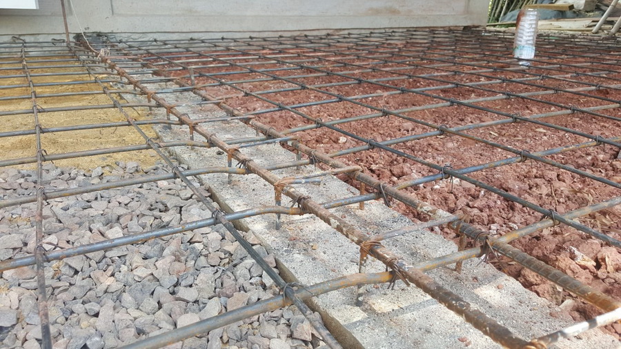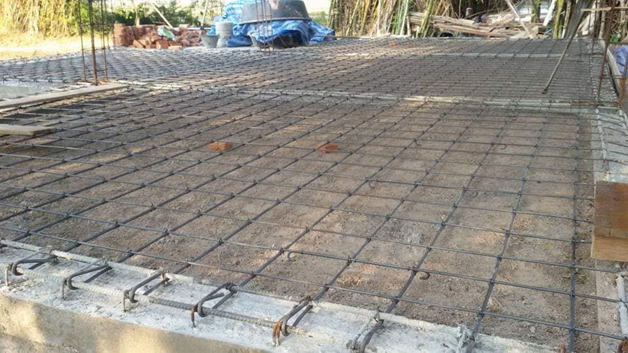 หลังจากเทคานเสร็จเรียบร้อย ผมก็สานเหล็กพื้น และสั่งรถแพลนปูนสำเร็จรูปมาเทพื้น จำนวน 5 คิว ราคาประมาณ 8,600 บาท