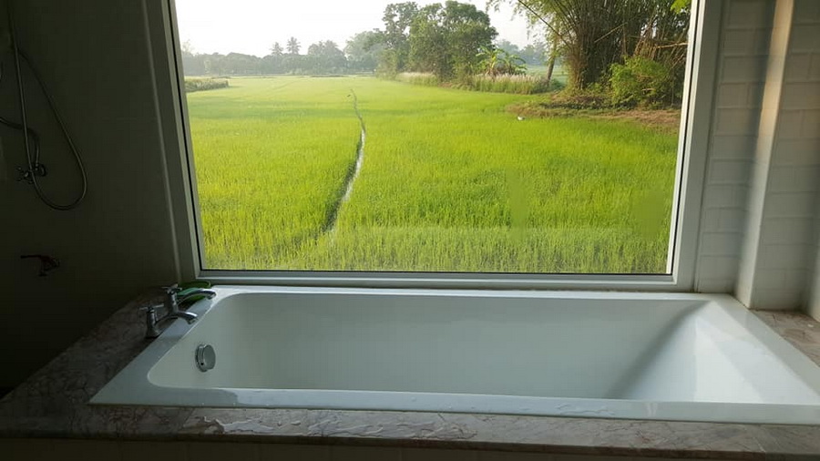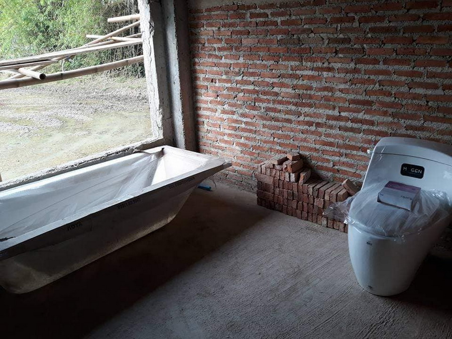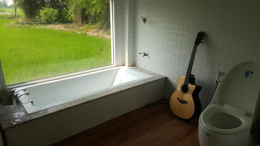 เริ่มที่ห้องน้ำครับ ภรรยาผมเขาอย่างได้อ่างไว้นอนแช่ดูทุ่งนา ผมก็เลยไปเดินเลือกซื้ออ่างที่โฮมโปรมา 2,300 บาท ชักโครกก็ไม่แพงครับ แต่จำราคาไม่ได้ เลือกแค่ที่พอใช้ได้