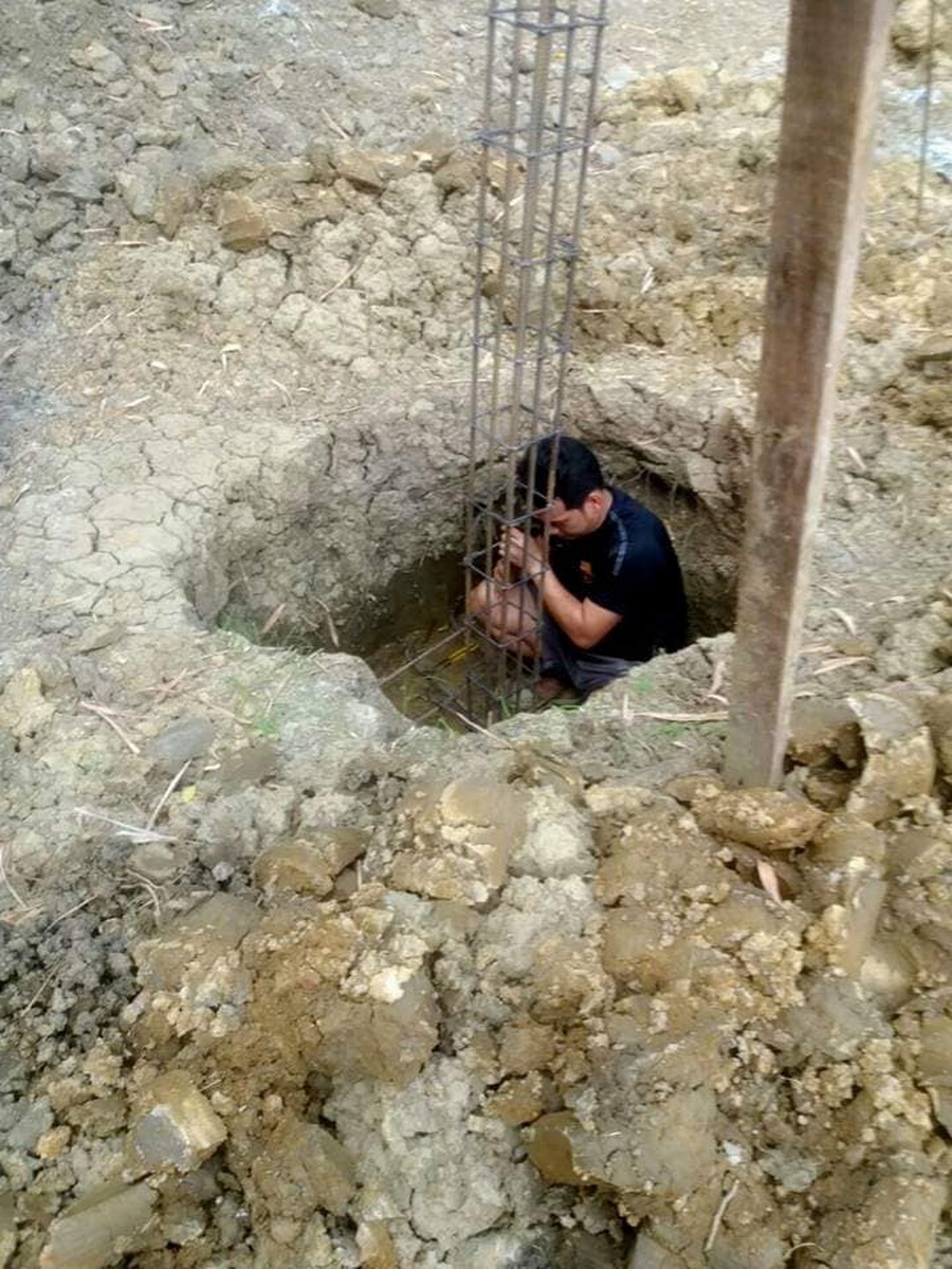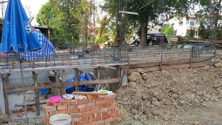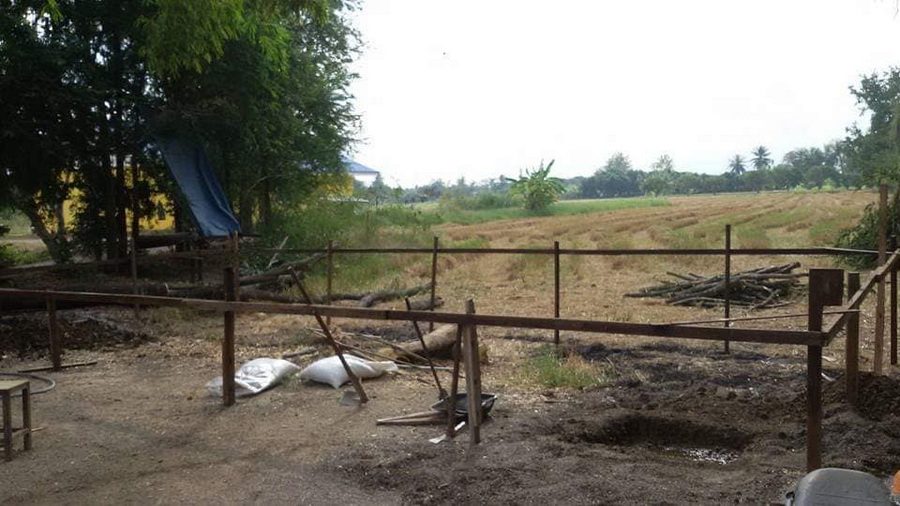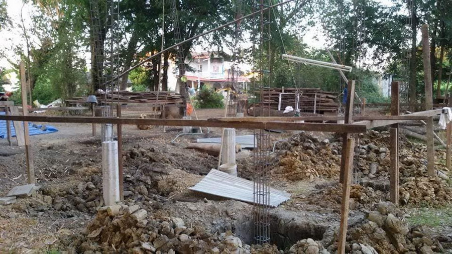 เริ่มการเลือกทำเลบนที่ดินและทำการตีผังขุดหลุมทำฐานราก ขุดเองกับใช้สองมือ กับอุปกรณ์ขุดที่พอจะมีพอจะหาได้ในบ้าน