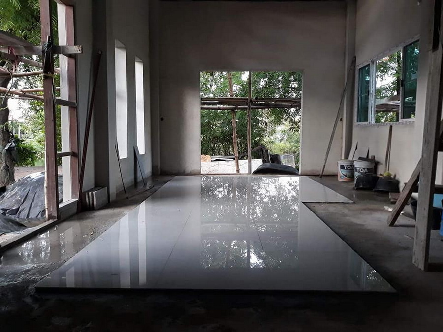 เริ่มปูกระเบื้องพื้นภายในบ้านครับ ผมเลือกใช้แกรนิโต้ สีครีม ตัวที่ถูกที่สุดครับ เน้นประหยัด ราคาประมาณ 155 บ/ตร.ม. คุณพ่อผมเป็นคนปูเองทั้งหลังครับ