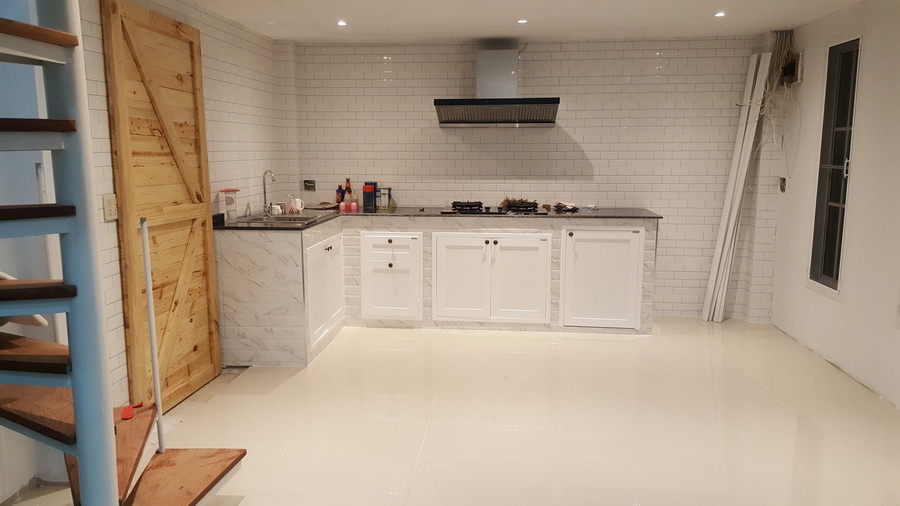 และก็ซื้อเหล็กมาเชื่อมทำบันไดวนขึ้นห้องนอนชั้นลอย ตามภาพ ส่วนใต้ห้องนอนก็จัดการซื้อแผ่นฝ้ามาตีเองตามที่เห็นครับ ส่วนซิงค์ครัวก็ไปสั่งบานประตูจากโฮมโปรครับโดนไป หมื่นสองพันบาท และอุปกรณ์ครัว เช่น Hood ดูดควัน + เตาแก๊ส ประมาณ 3 หมื่นบาท
