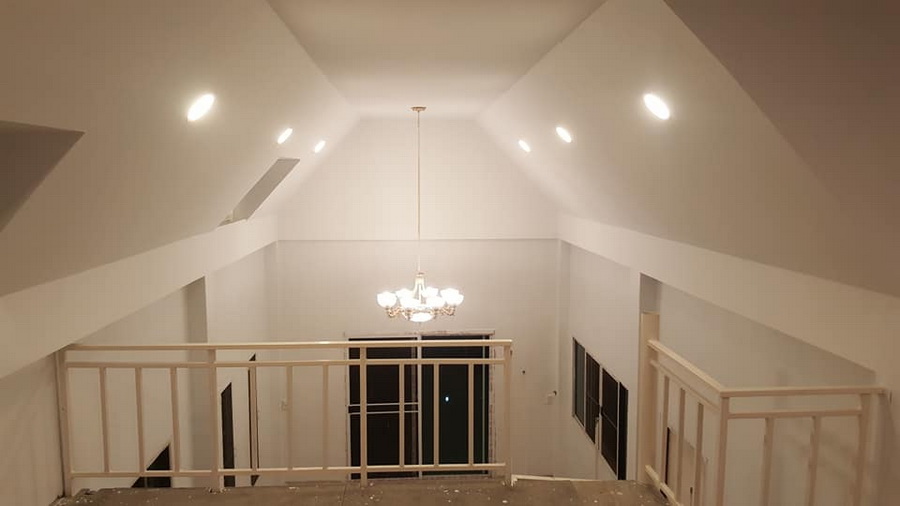 ในส่วนห้องโถงก็ตีฝ้าตามแนวหลังคาบ้าน เพื่อให้ดูโล่งและโปร่ง และหาโคมไฟเก๋ ๆ มาแขวนสัก 1 อัน