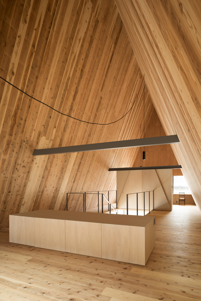 จากมุมนี้เราจะเห็นโถงชั้นสองได้อย่างชัดเจน พื้นที่แบบสามเหลี่ยมที่โดดเด่นสุด ๆ ผนังงานไม้ให้บรรยากาศที่อบอบอุ่นน่าอยู่สุด ๆ