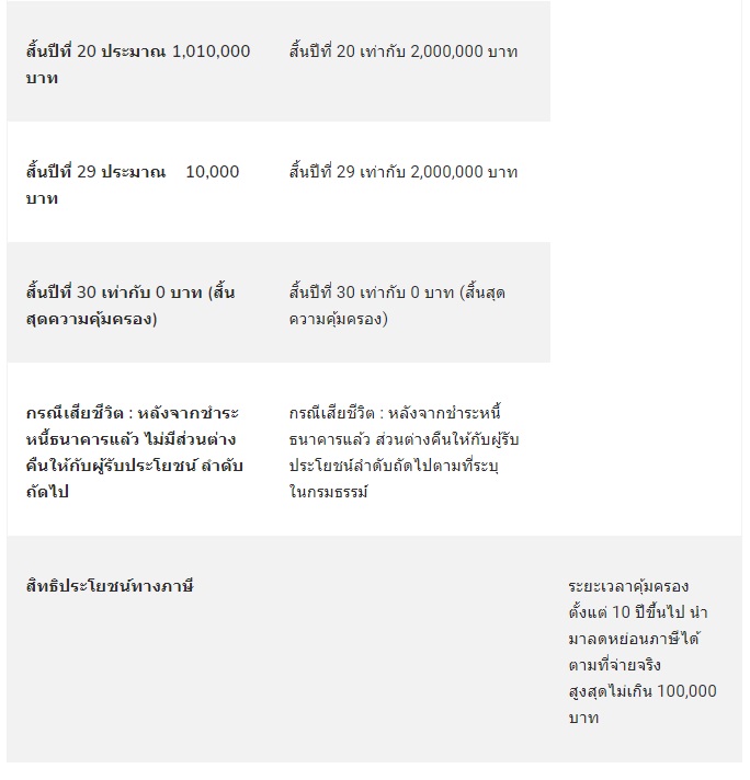 ส่วนใน ปีที่ 30 หากจากไปก่อนวัยอันควร จะไม่ได้รับความคุ้มครองตามยอดหนี้ เพราะผ่อนชำระหนี้หมดแล้วและสิ้นสุดความคุ้มครอง