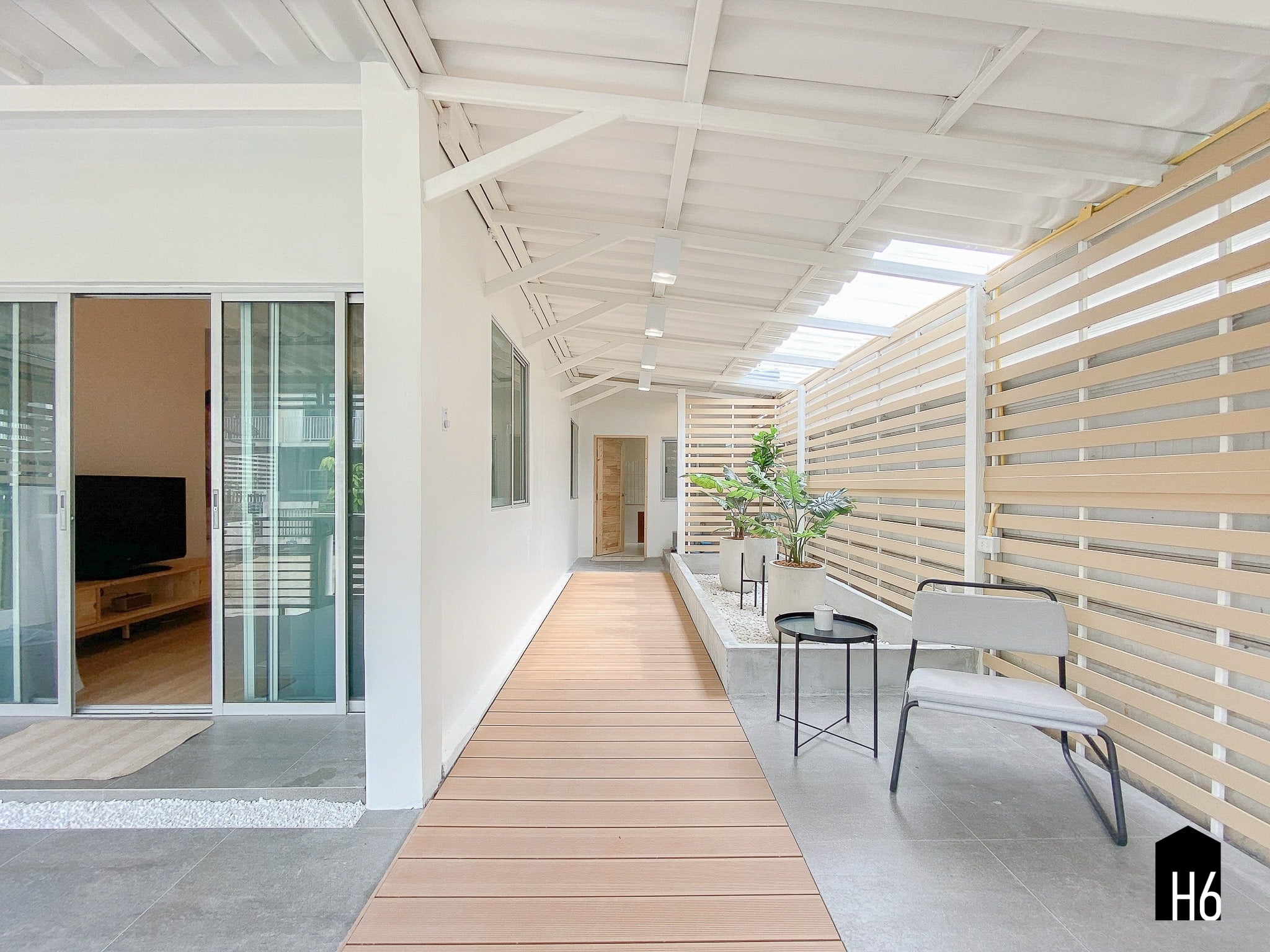 พื้นที่หน้าบ้านยังคงเก็บเอาลักษณะแบบเดิม ๆ เอาไว้ คือจะเน้นเป็นลานกว้างแบบโล่ง ๆ เพื่อให้สามารถใช้งานได้หลากหลายวัตุประสงค์
