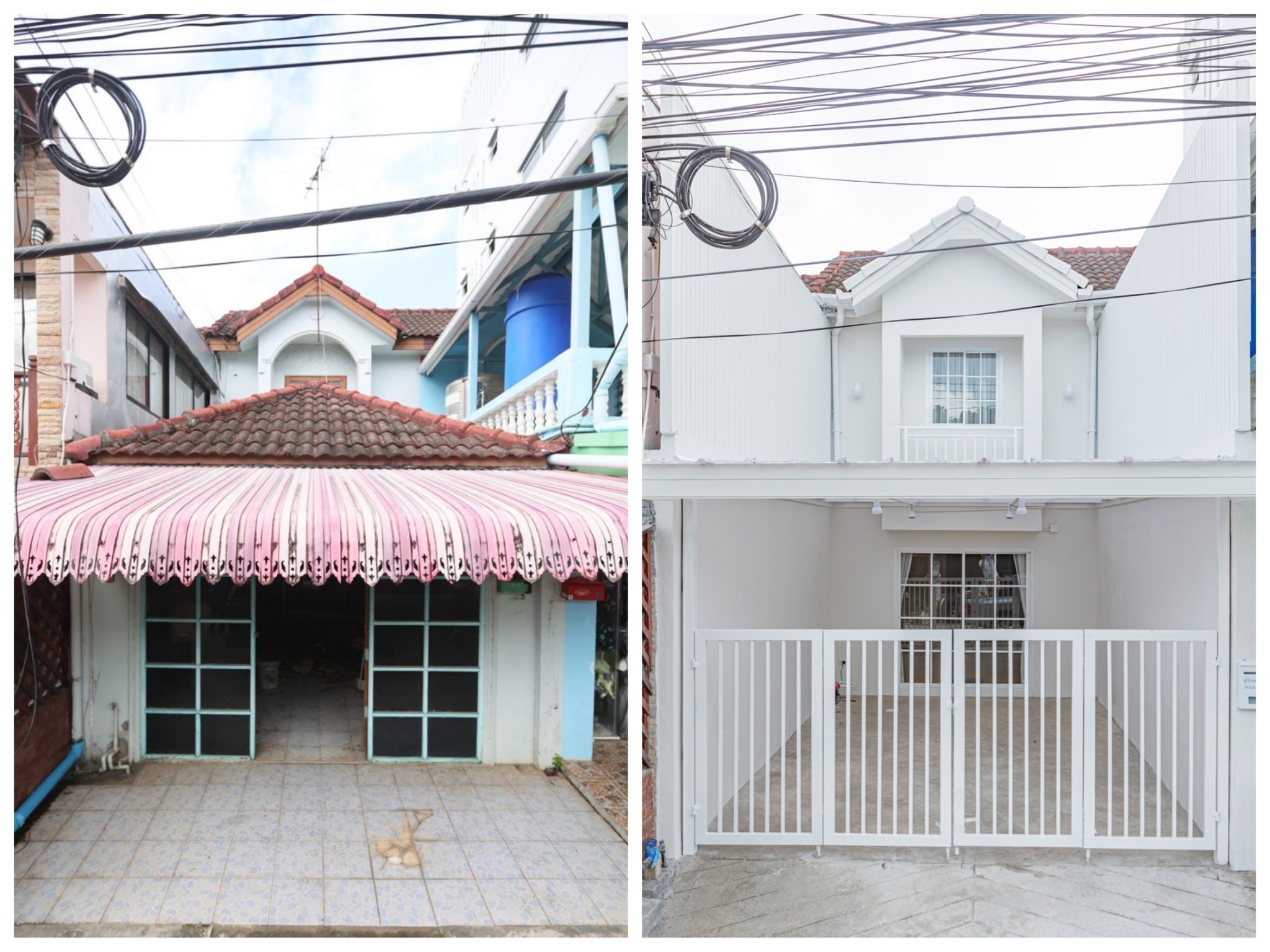 ทาวน์เฮ้าส์หลังนี้ตั้งอยู่ติดกับถนนหลักของหมู่บ้าน ระแวกนั้นจึงค้าขายกันเป็นส่วนใหญ่ ส่วนต่อเติมด้านหน้าบ้านของบ้านจึงรื้อออก และเปลี่ยนเป็นที่ว่างไว้สำหรับจอดรถได้ 1 คัน และปิดระแนงชั้นบนเพิ่มความเป็นส่วนตัว โดยโทนสีหลักที่ใช้จะเป็นโทนสีขาว