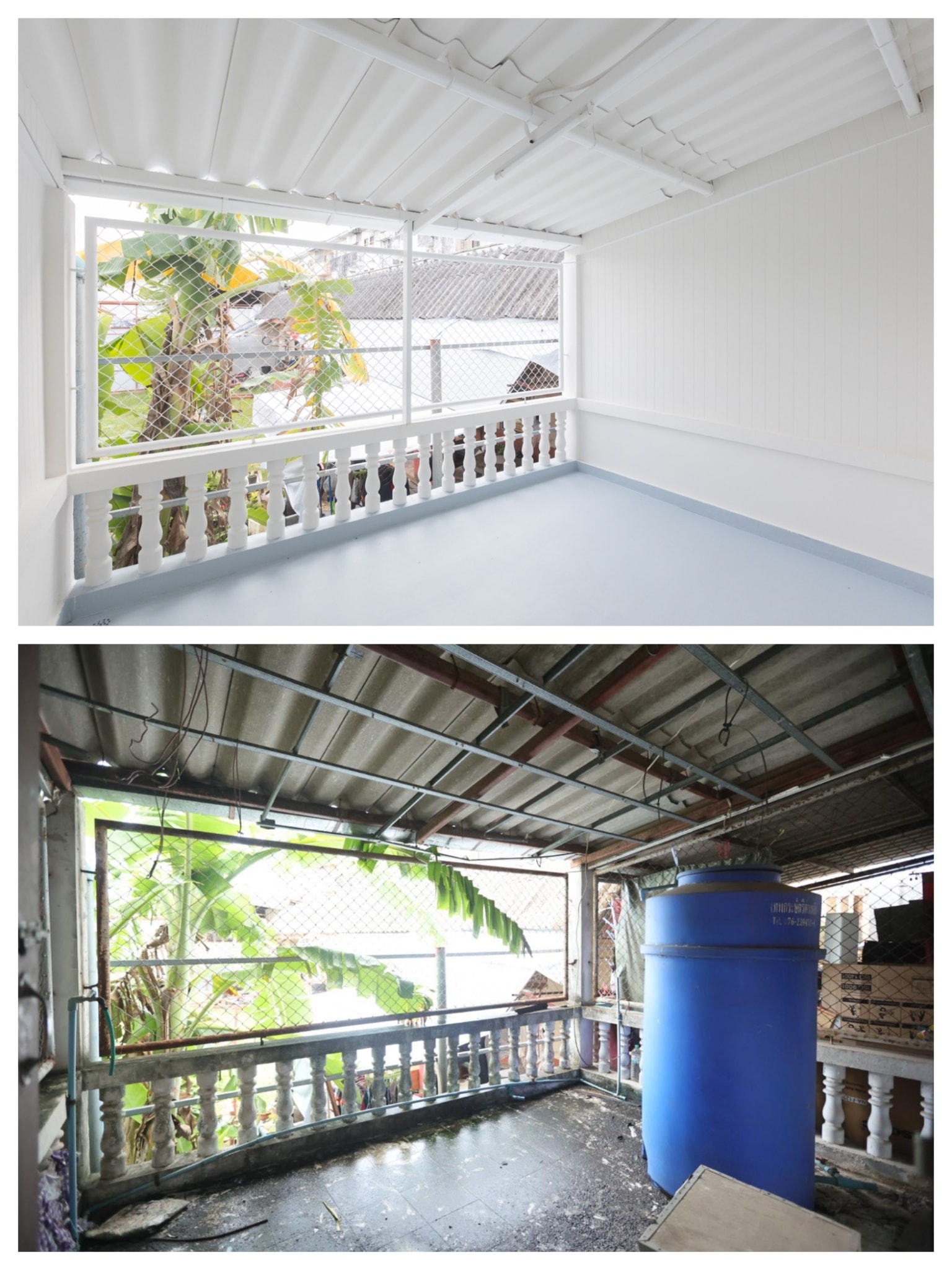 ย้ายถังเก็บน้ำไว้ชั้นล่าง รื้อกระเบื้องพื้นออก ลดน้ำหนักตรงระเบียงชั้นบน และทากันซึมที่พื้นระเบียง ปิดระแนงด้านข้างเพิ่มความเป็นส่วนตัว