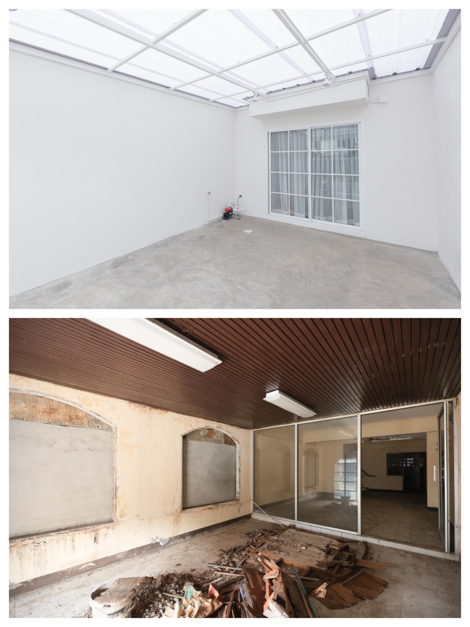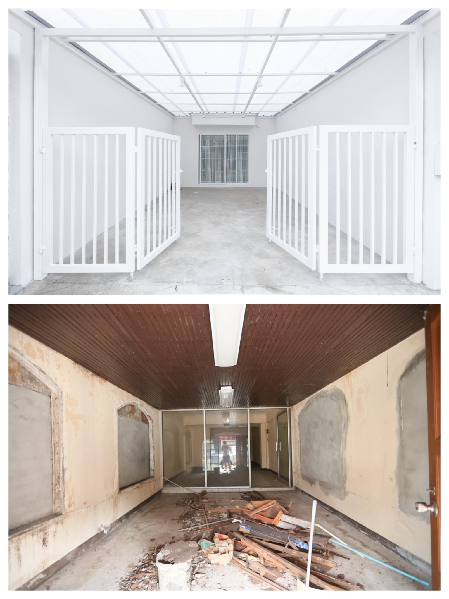 บริเวณหน้าบ้านจะรื้อส่วนต่อเติมที่มีบานประตู และใส่รั้วเหล็กแบบพับ ง่ายต่อการเปิดปิดในพื้นที่ที่จำกัด รื้อฝ้าระแนงไม้ทั้งหมดและเปลี่ยนเป็นหลังคาสีขาวขุ่นให้ดูโปร่ง จึงใช้ประโยชน์จากแสงธรรมชาติได้อย่างเต็มที่