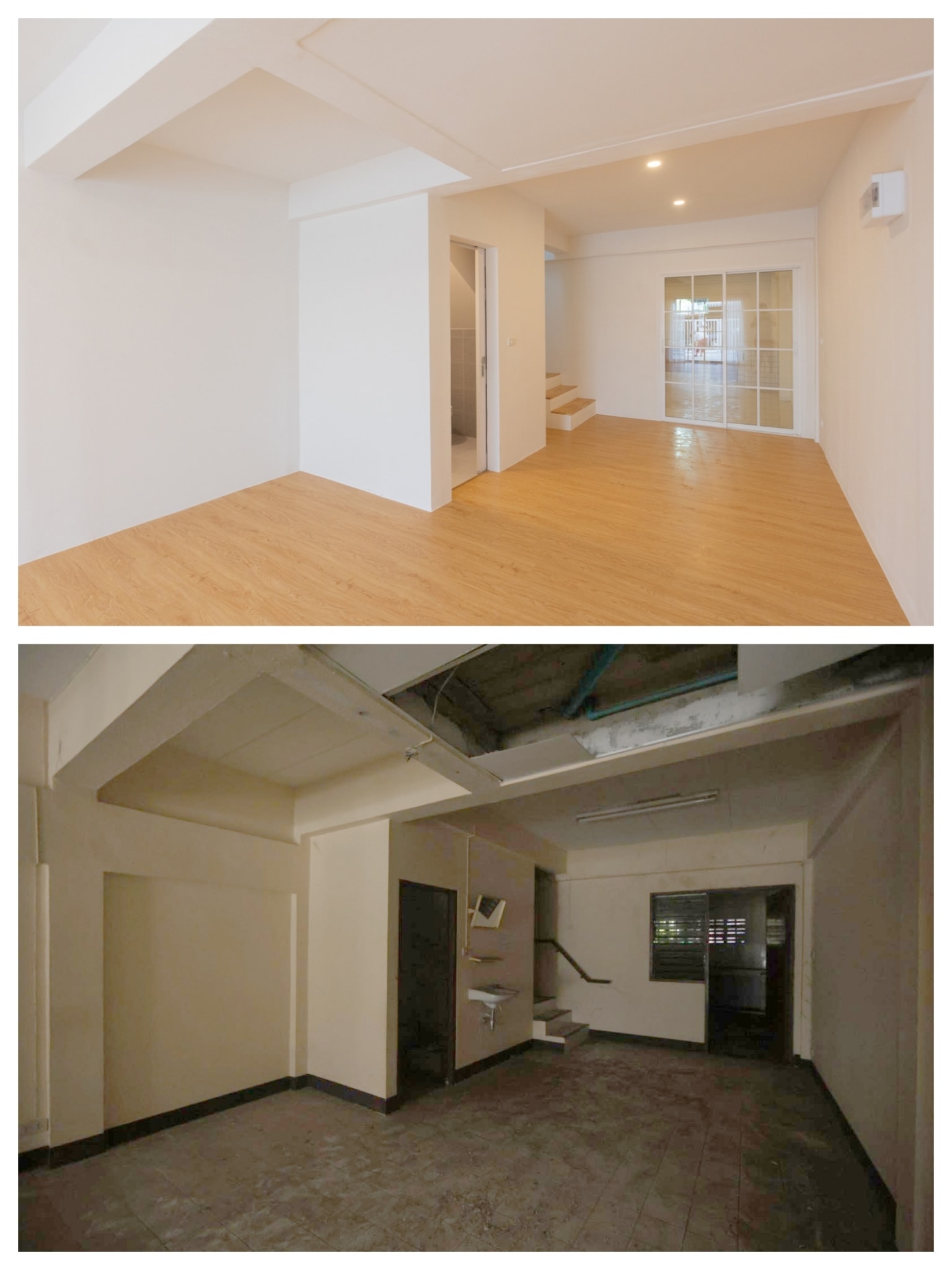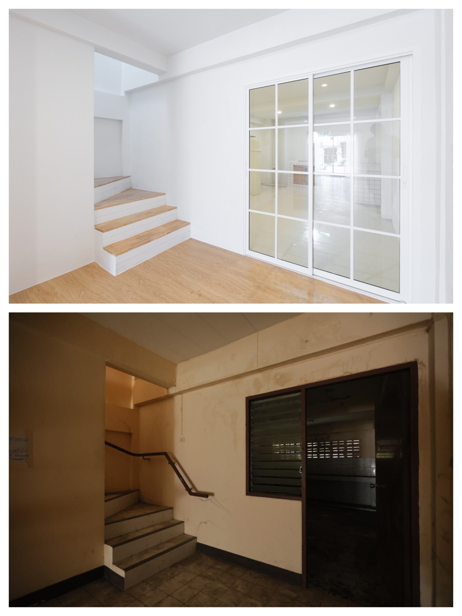 ตรงนี้เปลี่ยนชานพักบันไดเป็นแผ่นไม้ และถอดราวบันไดเดิมออก ทุบผนังประตูและหน้าต่างครัวเป็นประตูบานเลื่อน ใส่แถบสีขาวให้เข้ากับประตูหน้าบ้าน
