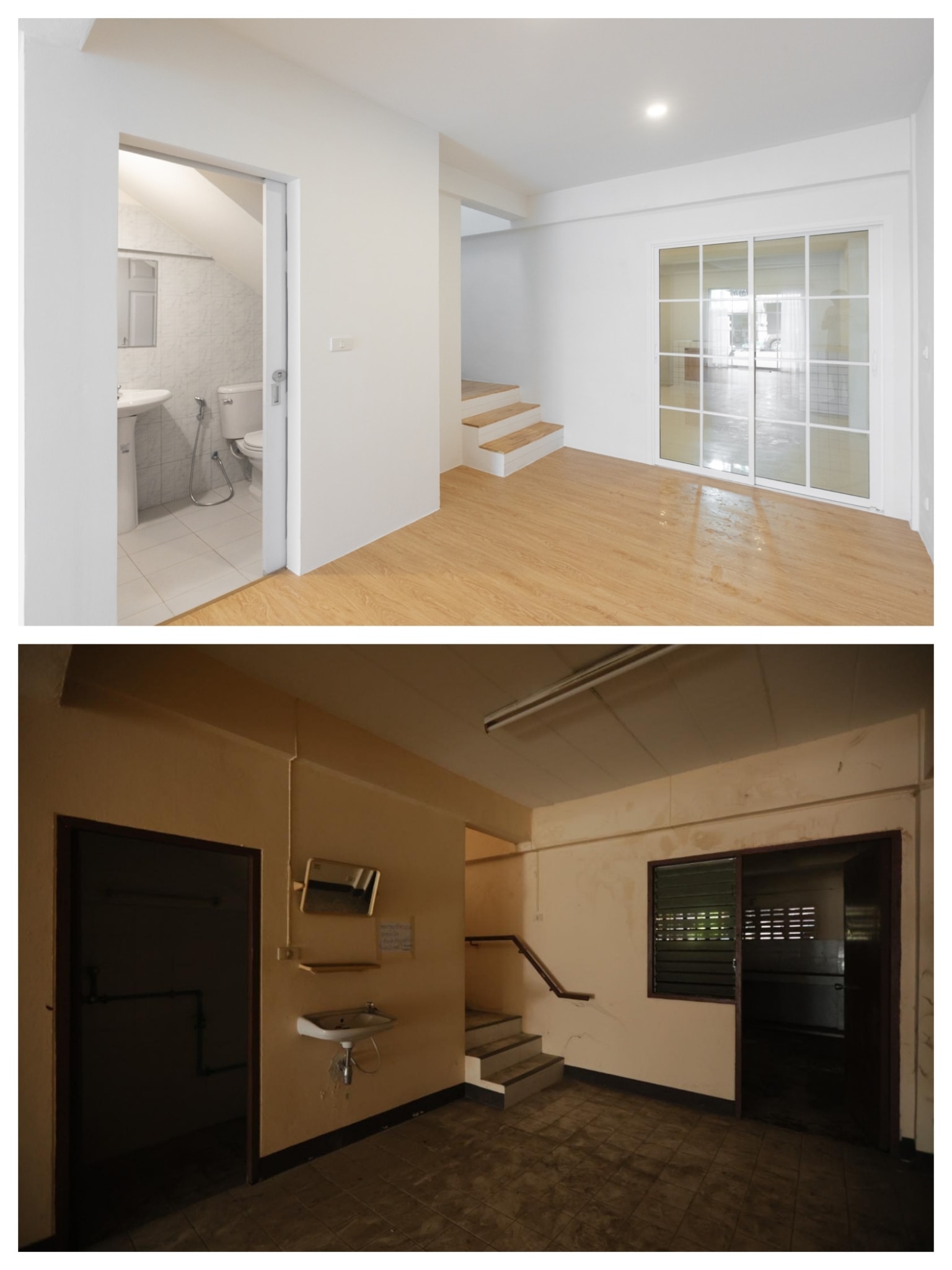 ส่วนนี้จะมีการขยายพื้นที่ห้องน้ำชั้นล่าง ย้ายสุขภัณฑ์ให้อยู่ในห้องน้ำทั้งหมด และเปลี่ยนทิศทางชักโครกเสริมฮวงจุ้ย เปลี่ยนบานประตูสวิงเป็นบานเลื่อนเพื่อสะดวกในการเปิด-ปิด