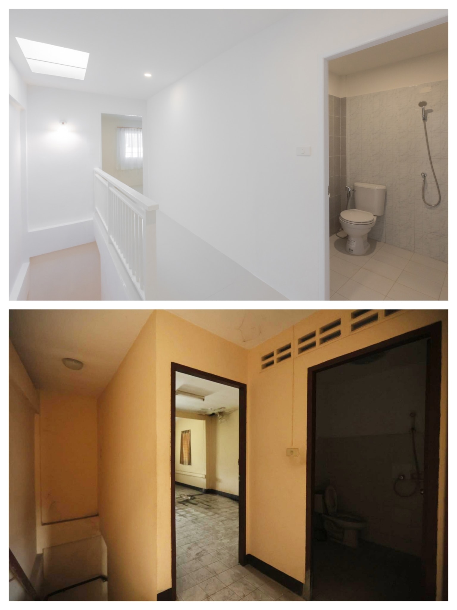 บริเวณนี้ได้ทุบผนังฝั่งบันไดทางขึ้น และกั้นผนังเบาใหม่ ขยายพื้นที่ชั้นบนให้ดูกว้าง ใส่ราวบันไดกันตก เจาะช่องแสงบนฝ้าเพดานใส่แผ่นโปร่งรับแสงธรรมชาติ เปลี่ยนกระเบื้องห้องน้ำทั้งผนังและพื้น พร้อมกับเปลี่ยนทิศทางชักโครก