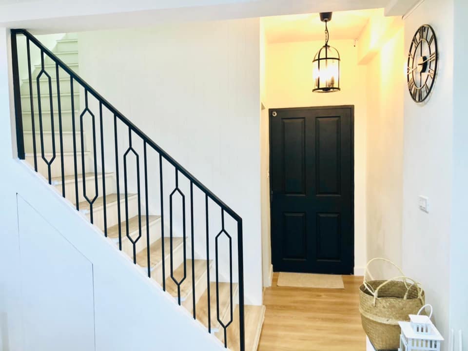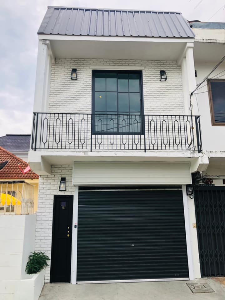 เรามาชมบ้านหลังนี้หลังจากผ่านการรีโนเวทกันเลย ตัวบ้านเป็นตึกแถวสองชั้นที่ให้รายละเอียดการตกแต่งที่ดูโมเดิร์น รายละเอียดการตกแต่งนั้น ภายนอกบ้านมีผนังอิฐโชว์แนวในโทนสีขาว ประตูเข้าออกบ้านจะเป็นประตูม้วนเหล็กสีดำที่ตัดกับสีขาวได้อย่างสวยงาม