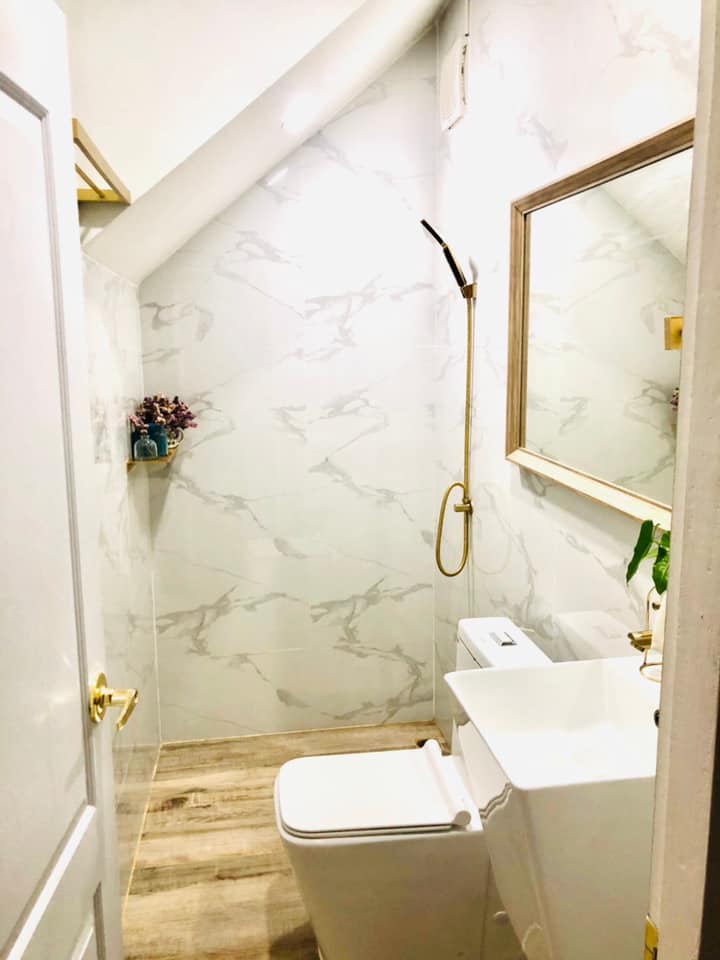 ห้องน้ำของบ้านถูกตกแต่งภายในด้วยดีไซน์ที่หรูหราจากผนังลายหินอ่อนและอุปกรณ์อื่น ๆ ในสีทอง โดยภายในห้องน้ำก็จัดวางองค์ประกอบต่าง ๆ ภายในพื้นที่ได้อย่างคุ้มค่า