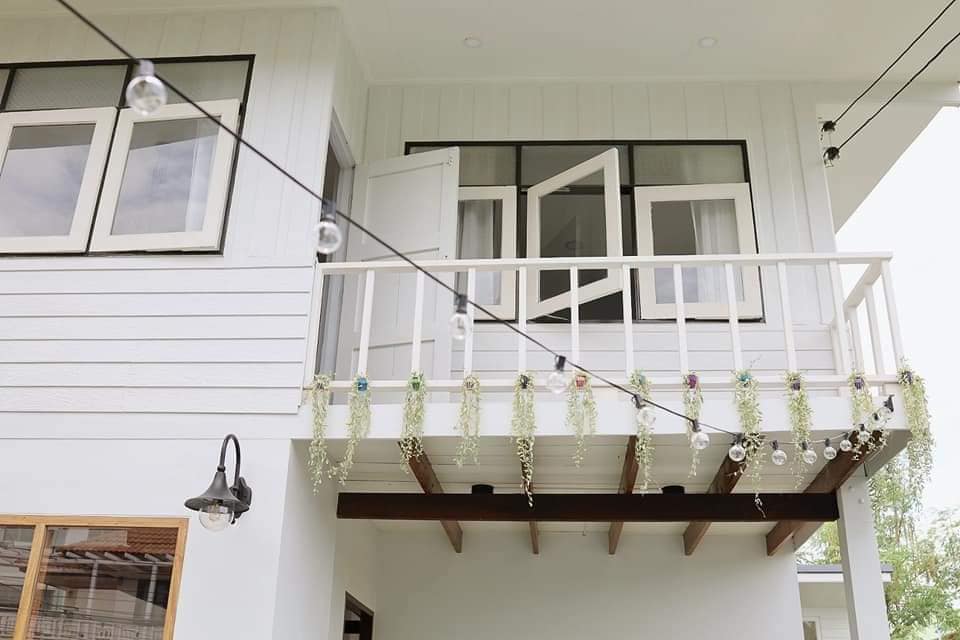 พื้นที่ระเบียงชั้นสองของบ้านที่มีลักษณะเดิม ๆ แต่ตอนนี้ถูกทาด้วยสีขาวทั้งหมด พร้อมกับตกแต่งด้วยต้นไม้เล็ก ๆ กลายเป็นมุมพักผ่อนอีกแห่งของบ้าน