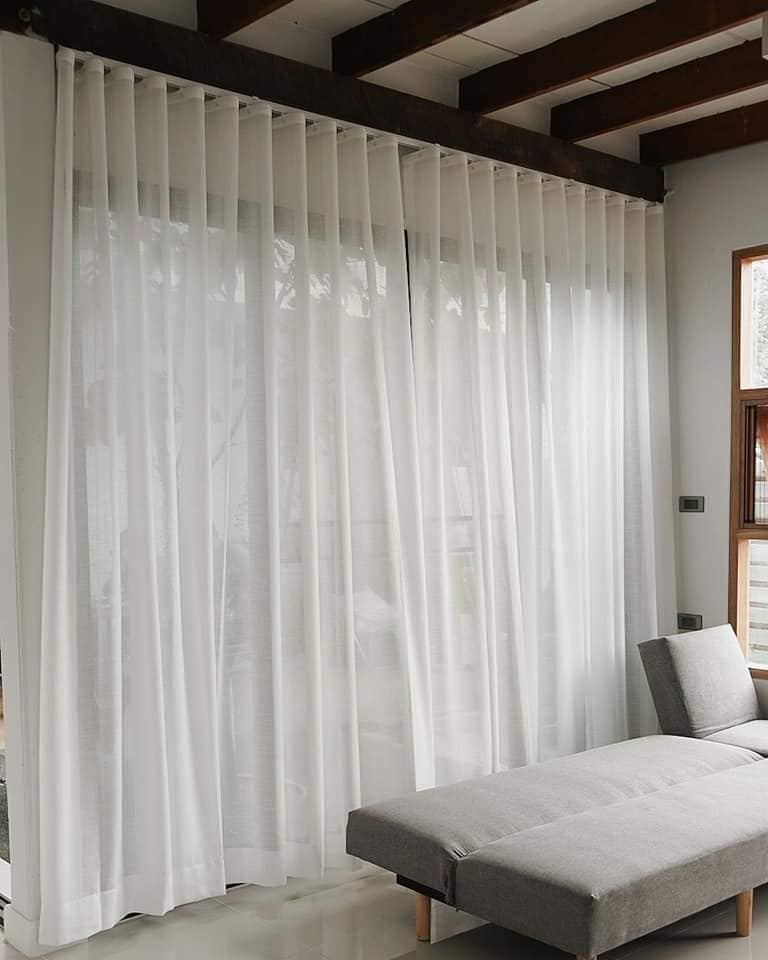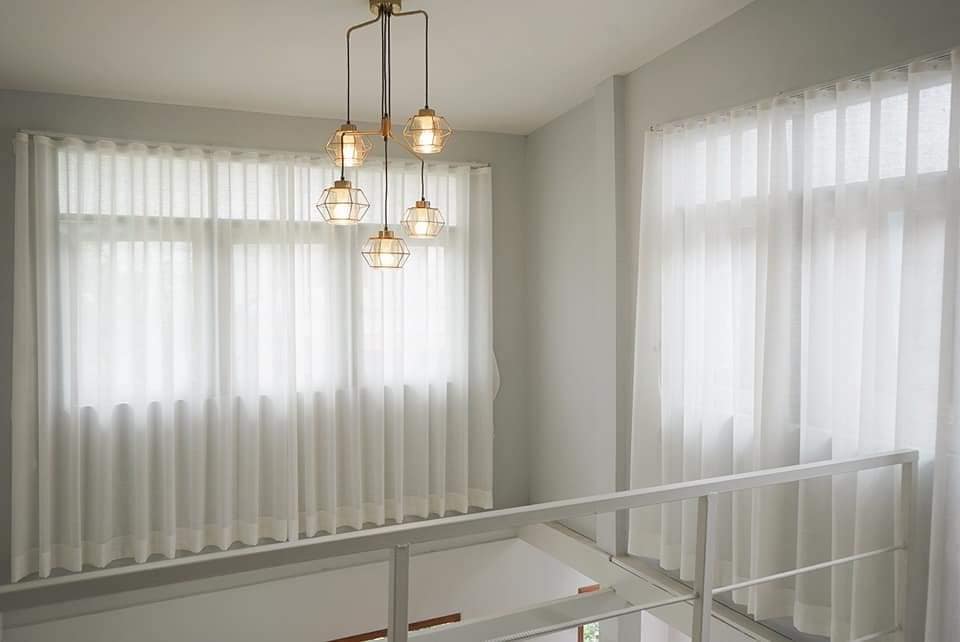 ภายในบ้านถูกตกแต่งด้วยกลิ่นอายแบบโมเดิร์น ซึ่งสะท้อนผ่านออกมาจากผ้าม่านและโคมไฟระย้าที่ห้อยลงมาจากเพดาน